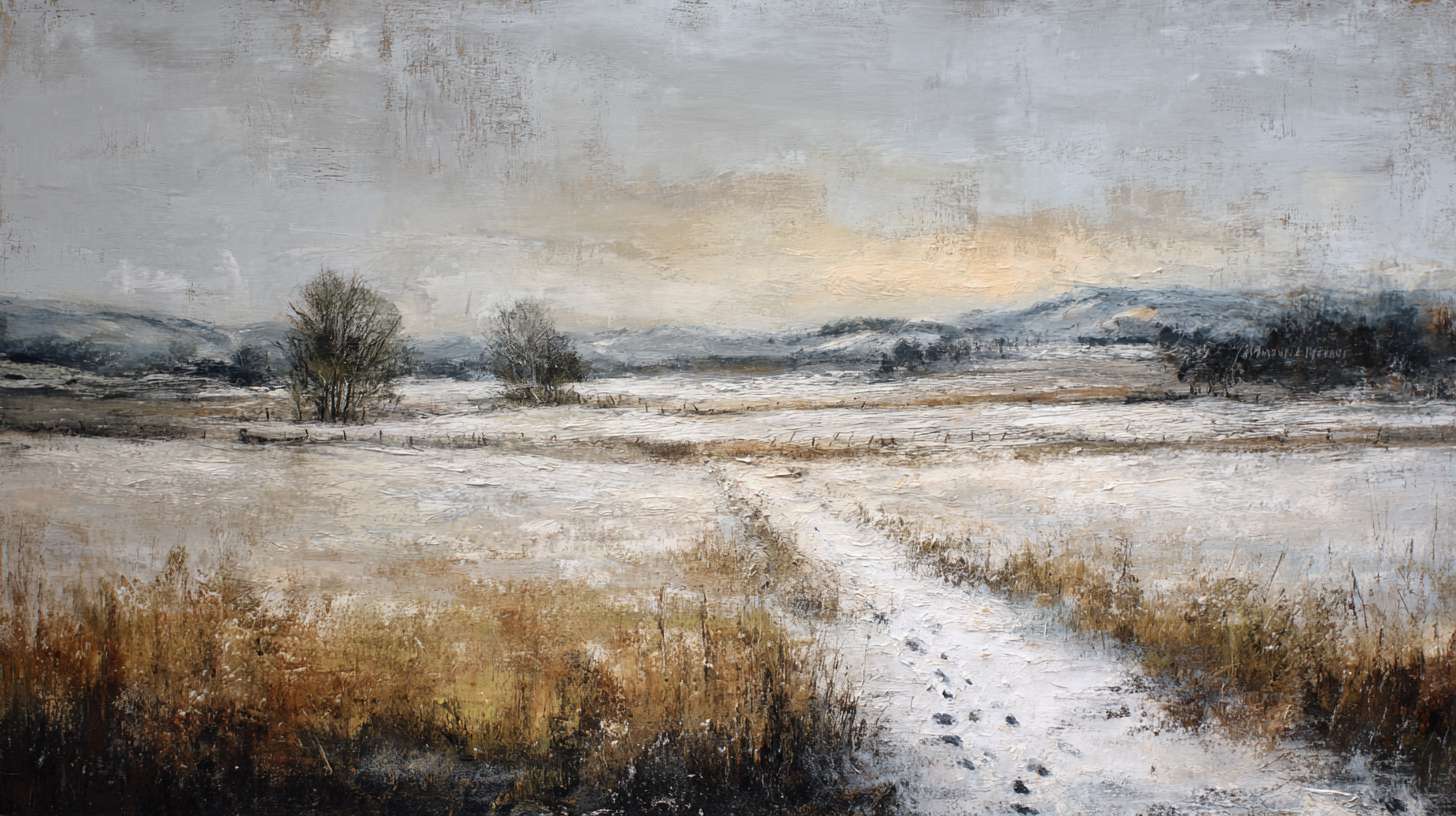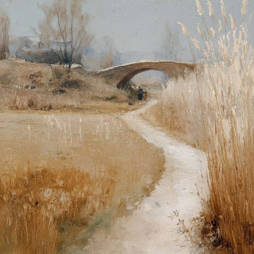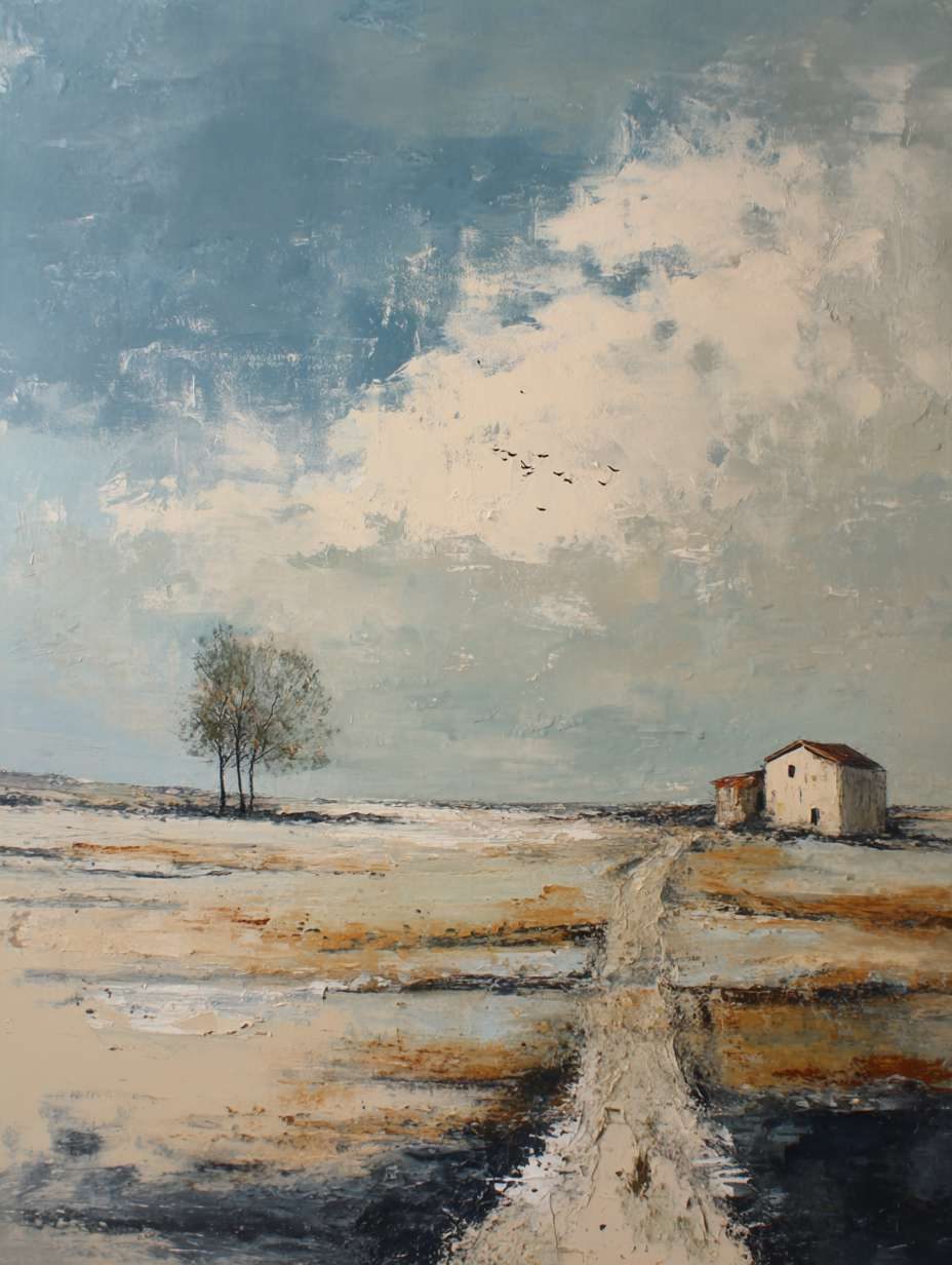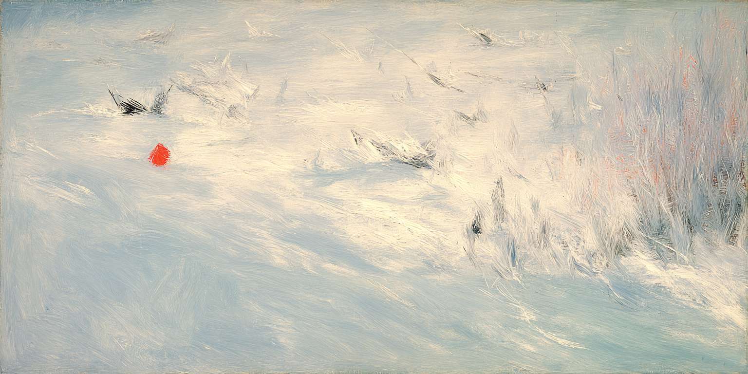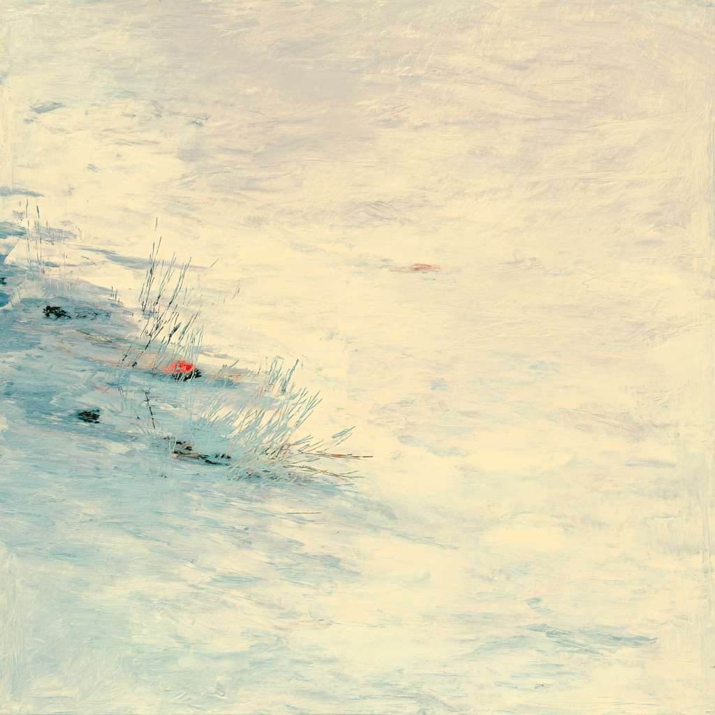 抽象油画《雪境·朱迹》 2025年9月17日 作者:weeder 淡青的绢帛向西风展开,三笔两笔便睡成了冬。是莫奈的调色盘倾侧时,漏下一勺朦胧的梦。苇草在灰白里曲着腰肢,学不会蝴蝶的轻盈。唯有你——一粒朱砂,从砚池底浮起,忽然站定。像那年渡口边的绒帽子,被篙师点进水纹里;或是冻云深处某盏灯笼,被山鬼遗忘在雪脊。我欲俯身拾取这暖意,指尖却生出新雪。原来有些印记天生便适合,望着,望着,直至天地都褪成一封未写完的信札。 上一篇古典油画《蓝野低语·灰穹絮语》下一篇 印象派油画《海隅的野菊絮语》 发表回复 取消回复您的邮箱地址不会被公开。 必填项已用 * 标注评论 * 显示名称 * 邮箱 * 网站 在此浏览器中保存我的显示名称、邮箱地址和网站地址,以便下次评论时使用。