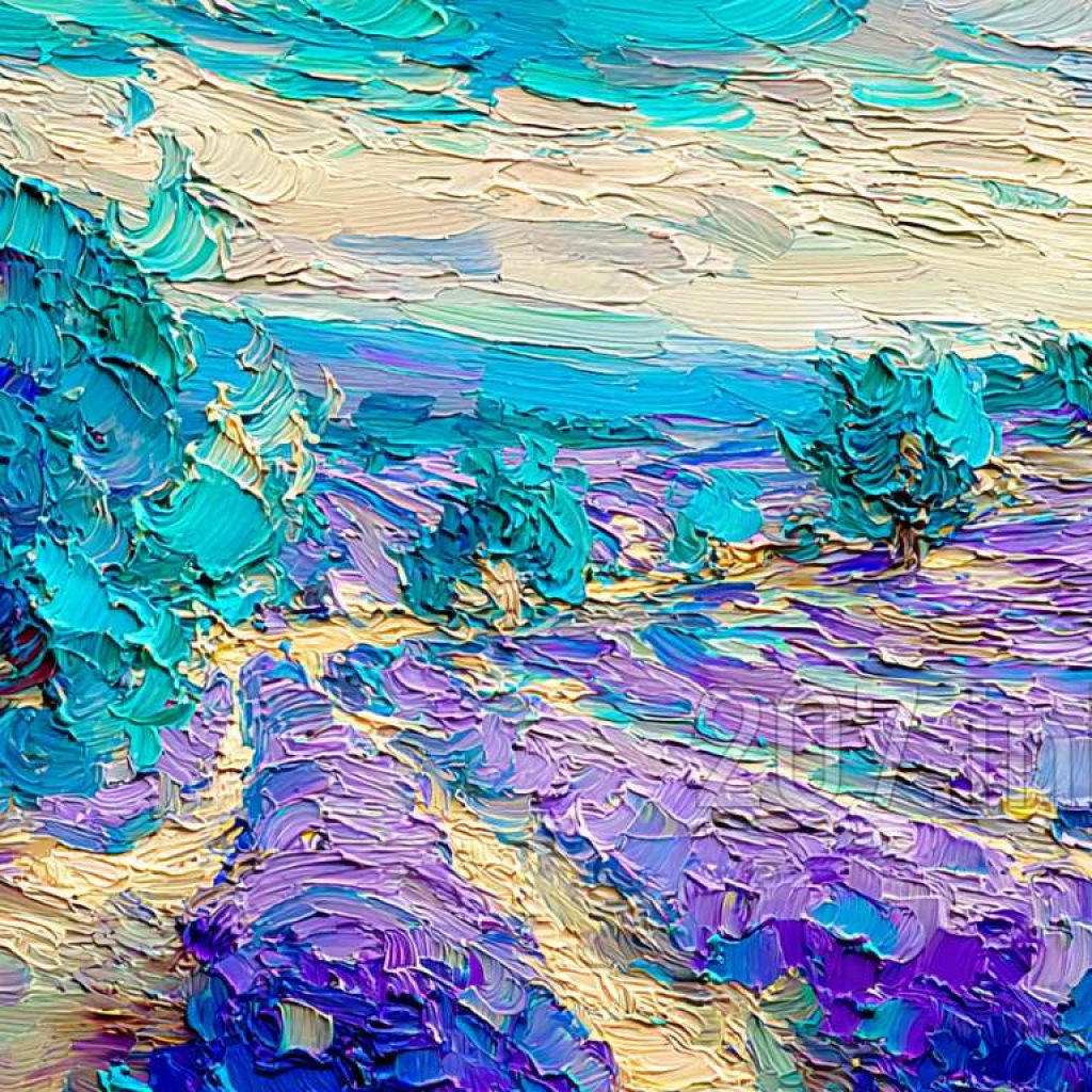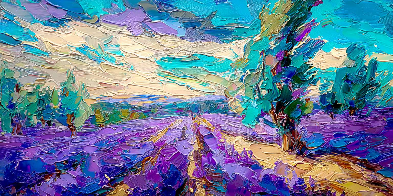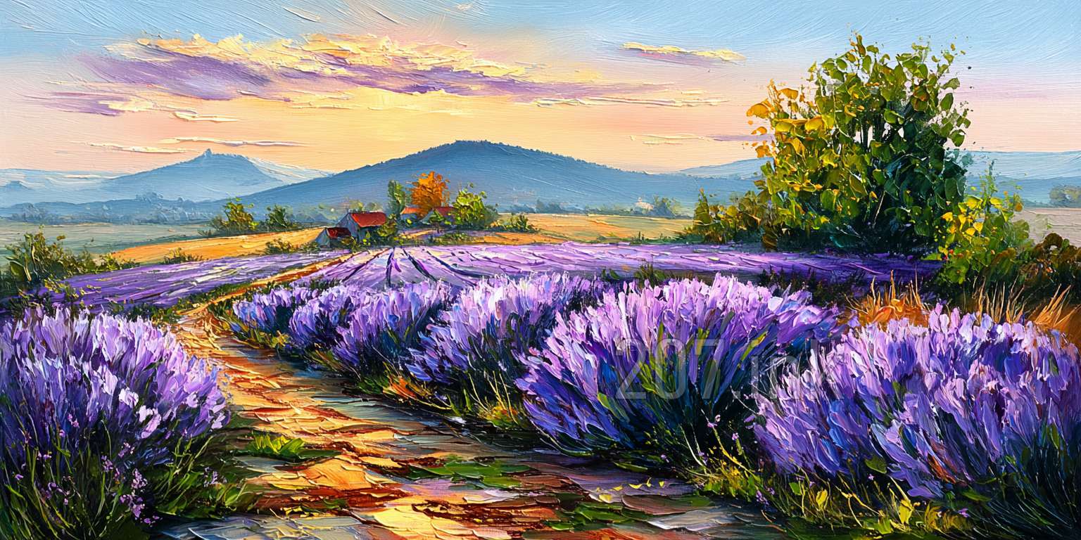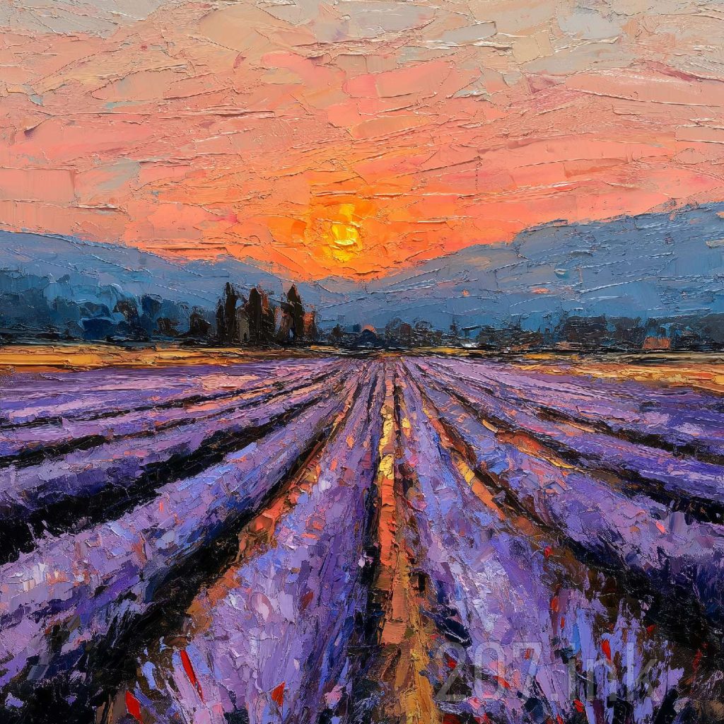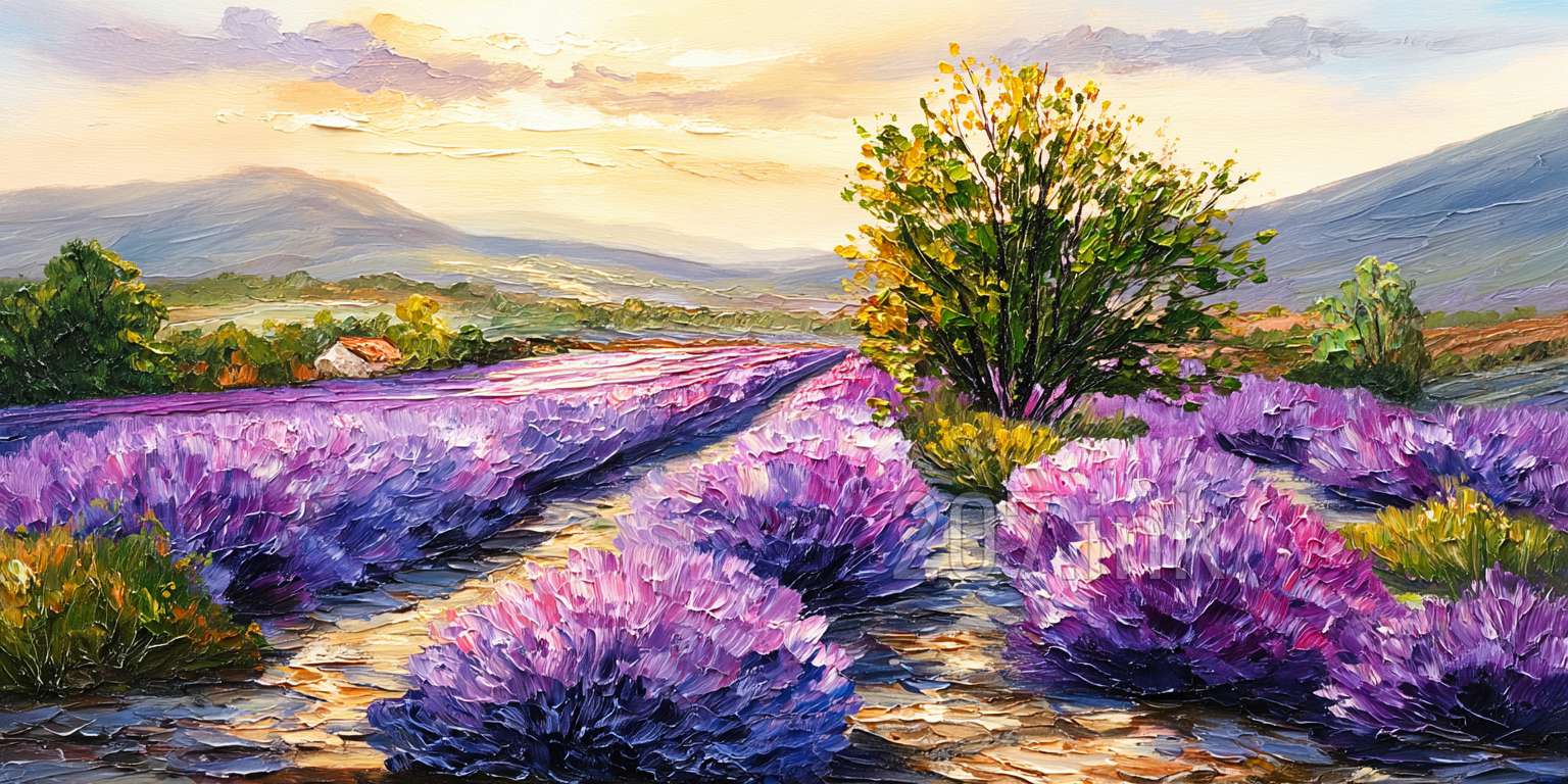 印象油画《阳光洒满的薰衣草田》