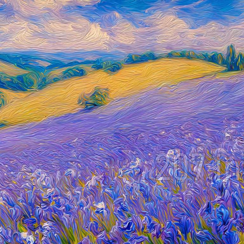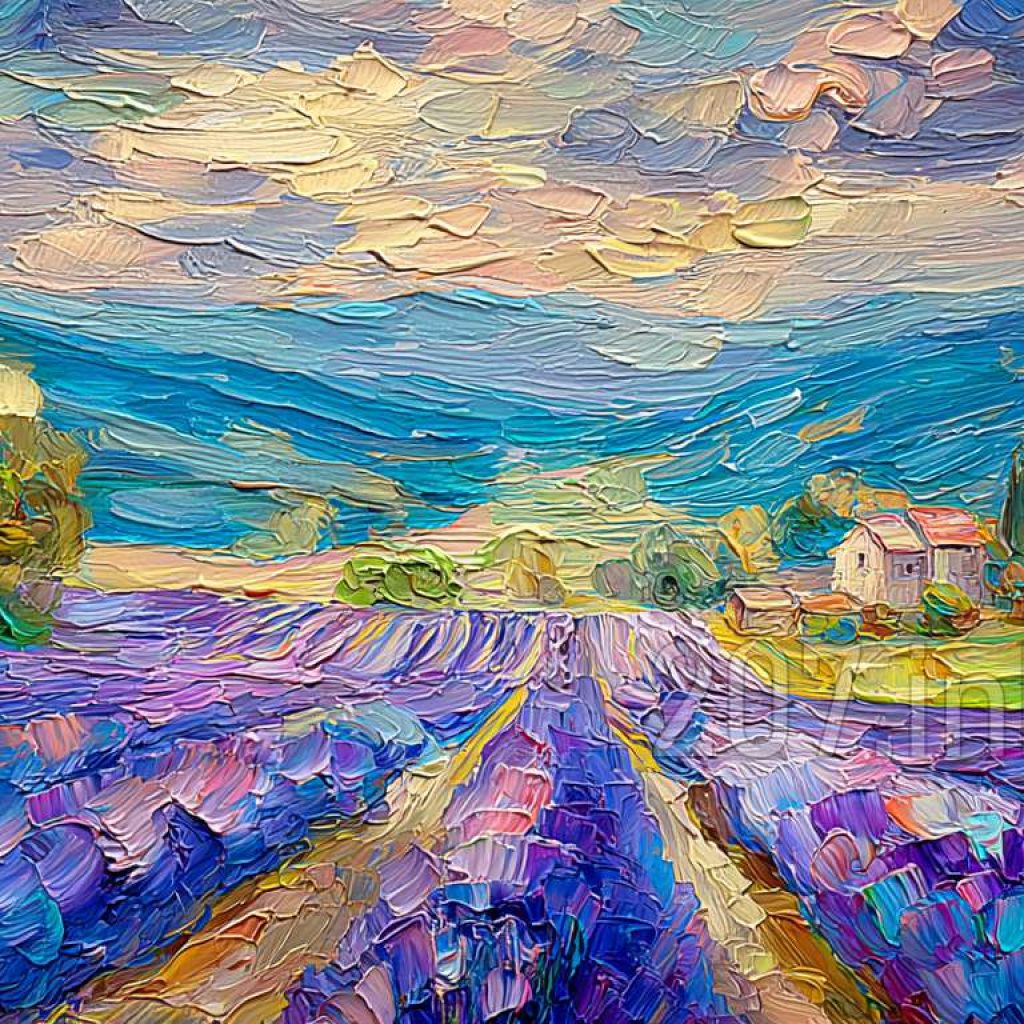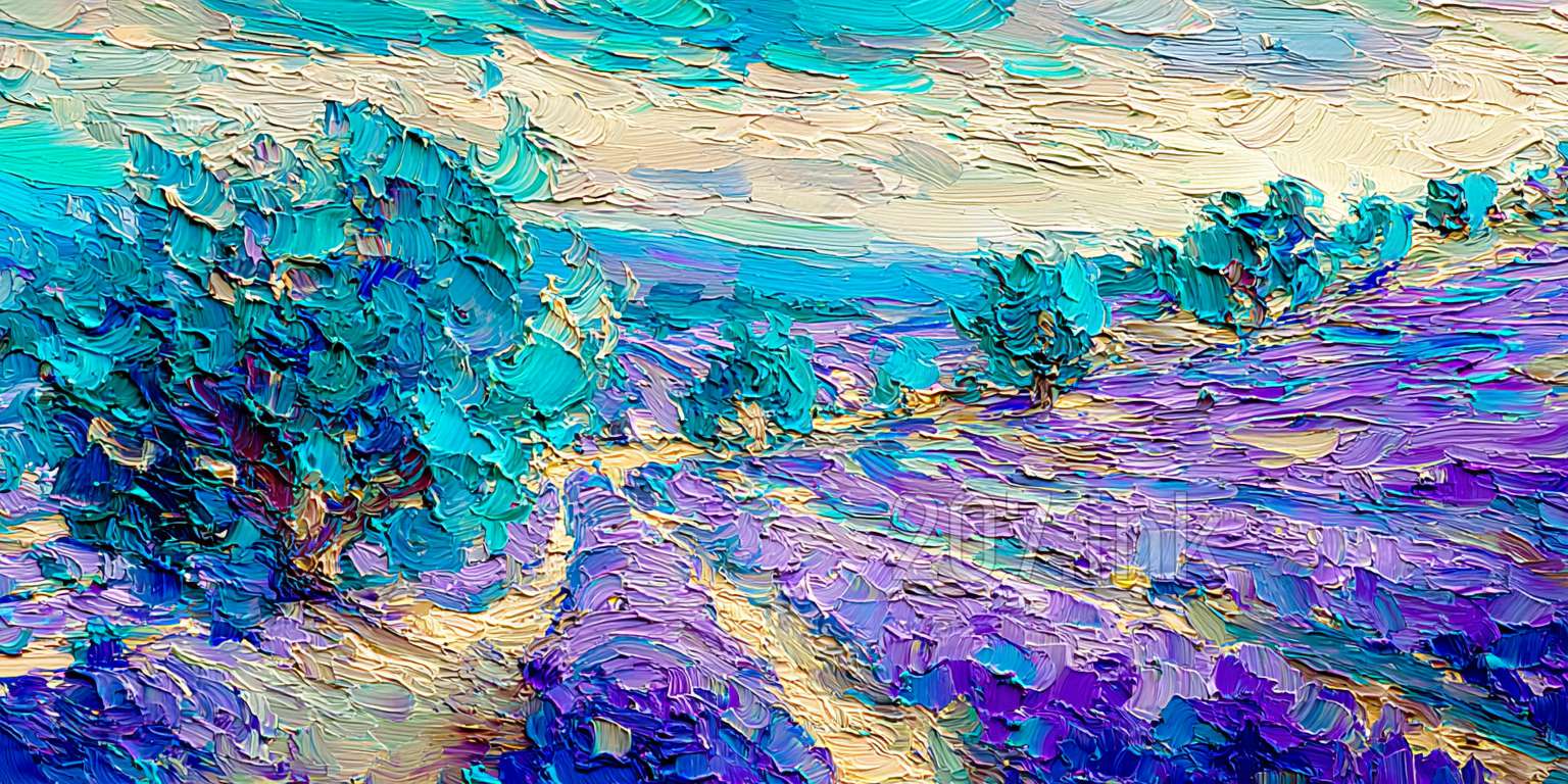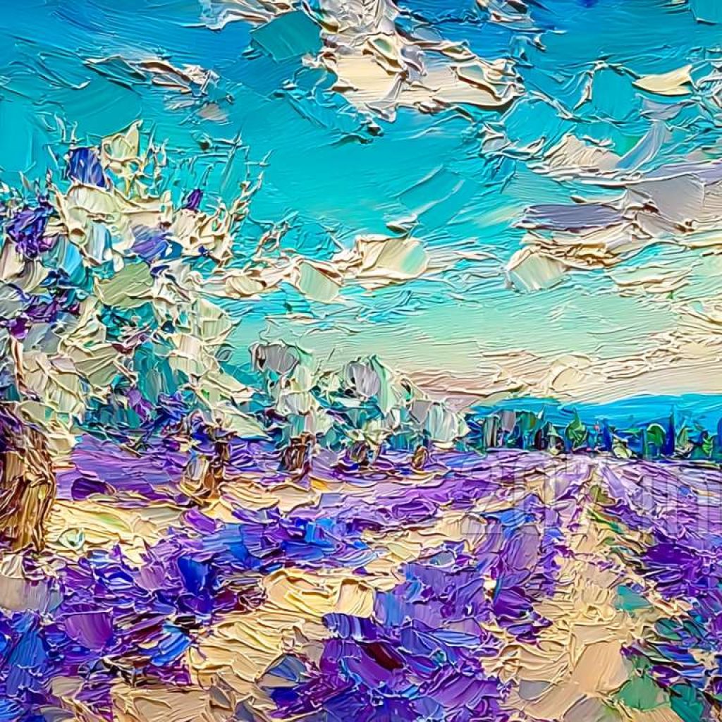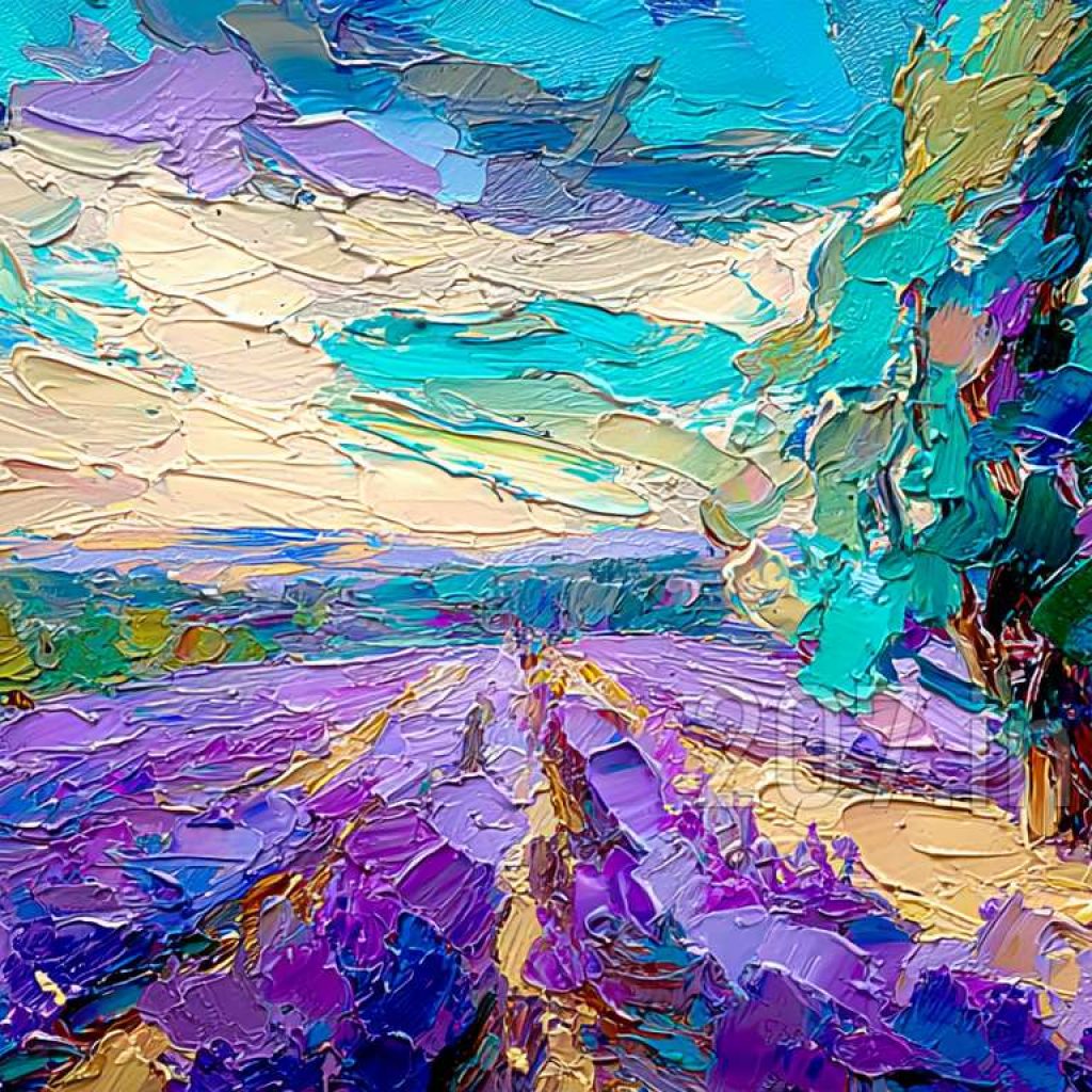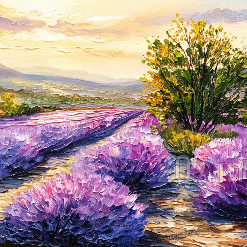 印象油画《阳光洒满的薰衣草田》