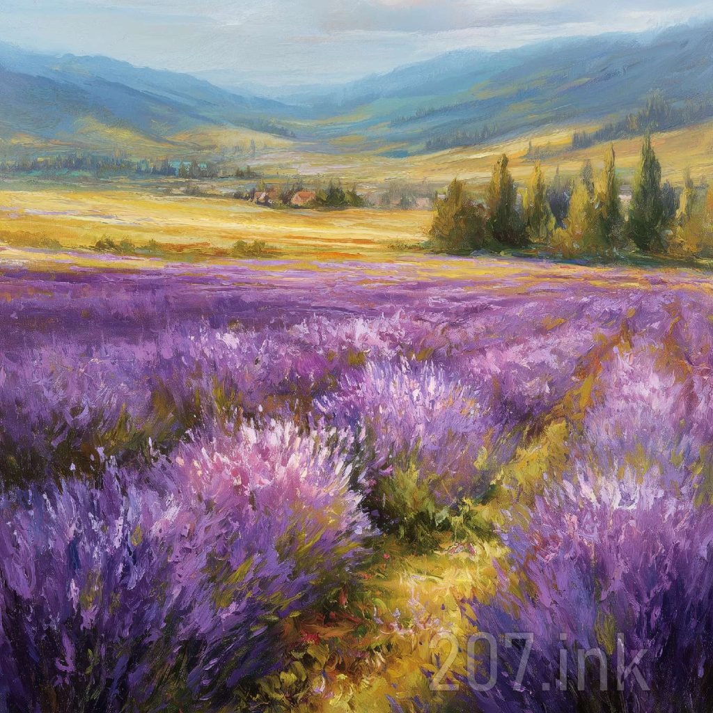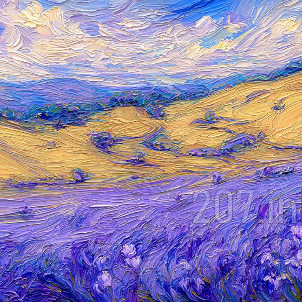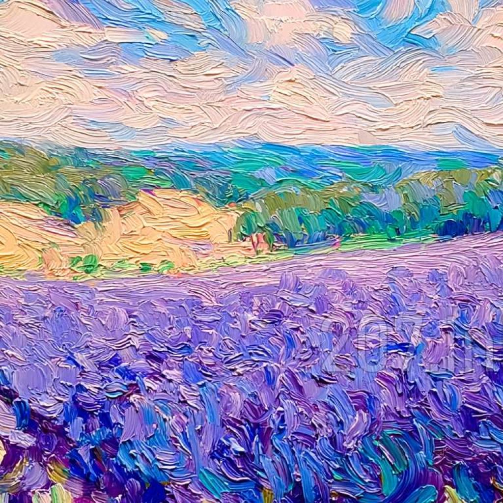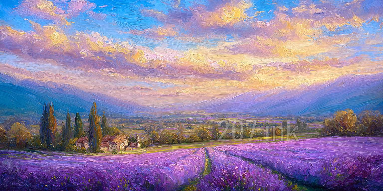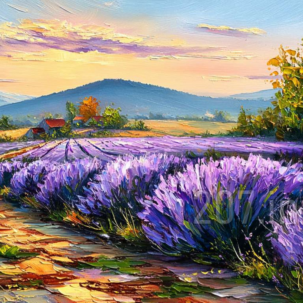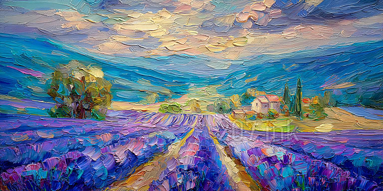 印象油画《阳光洒满的薰衣草田》