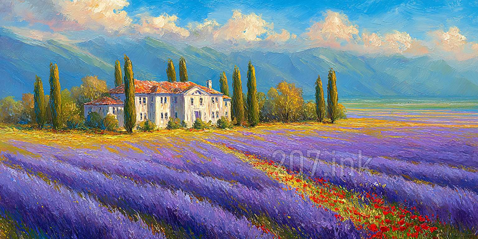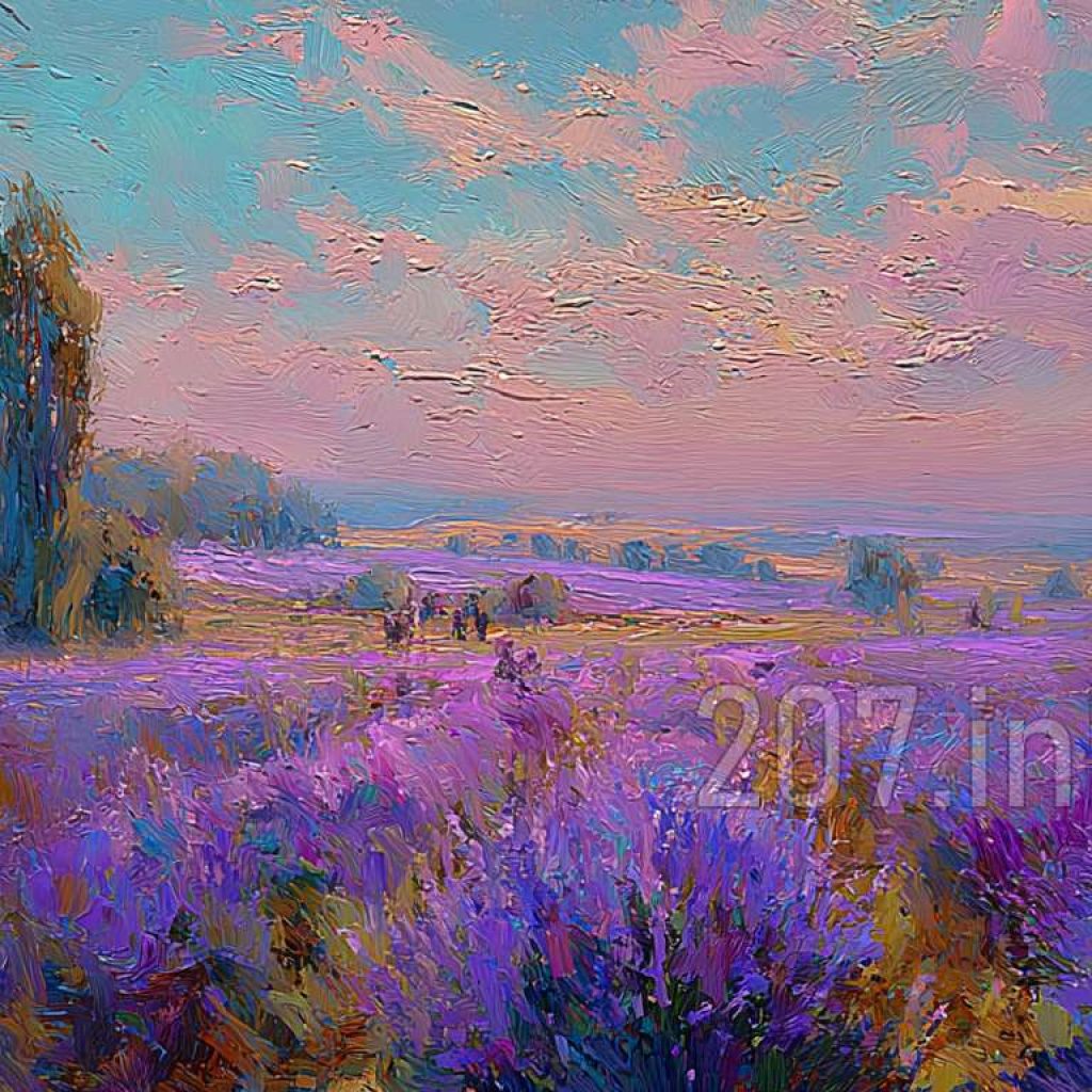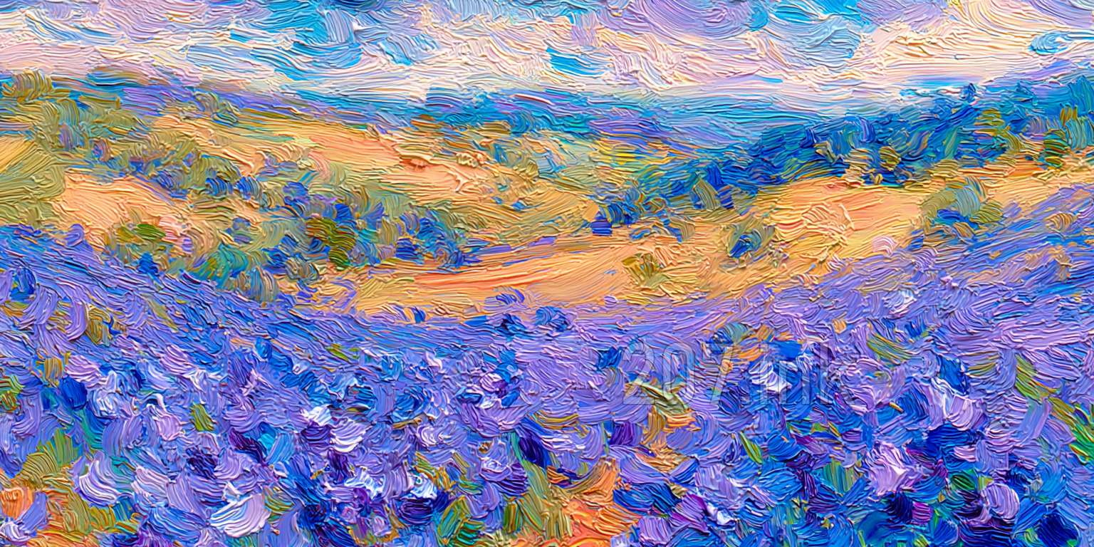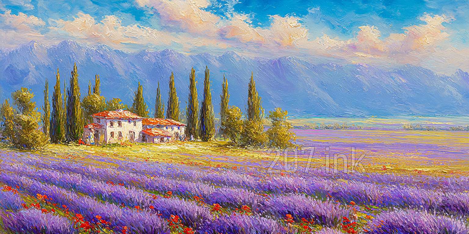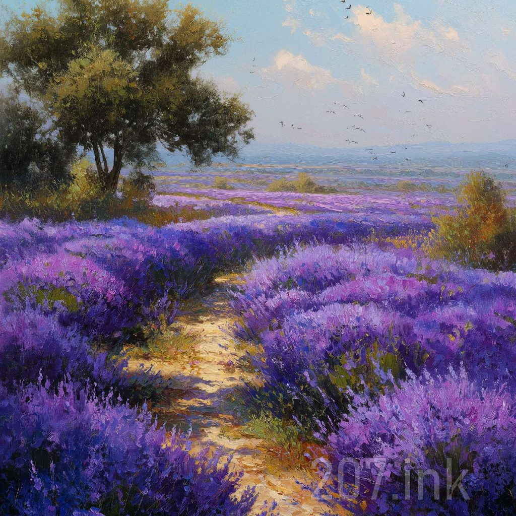 印象油画《阳光洒满的薰衣草田》