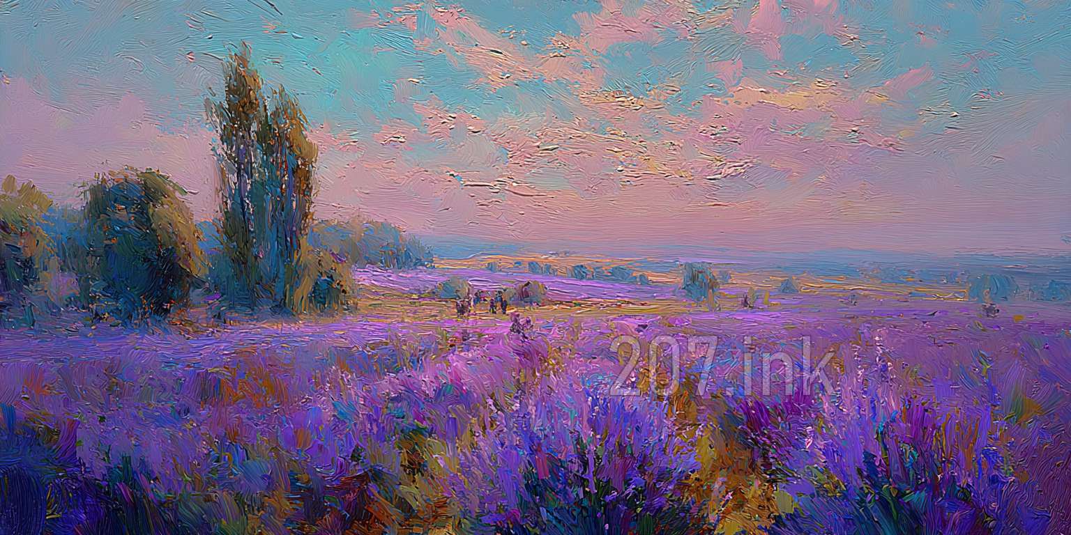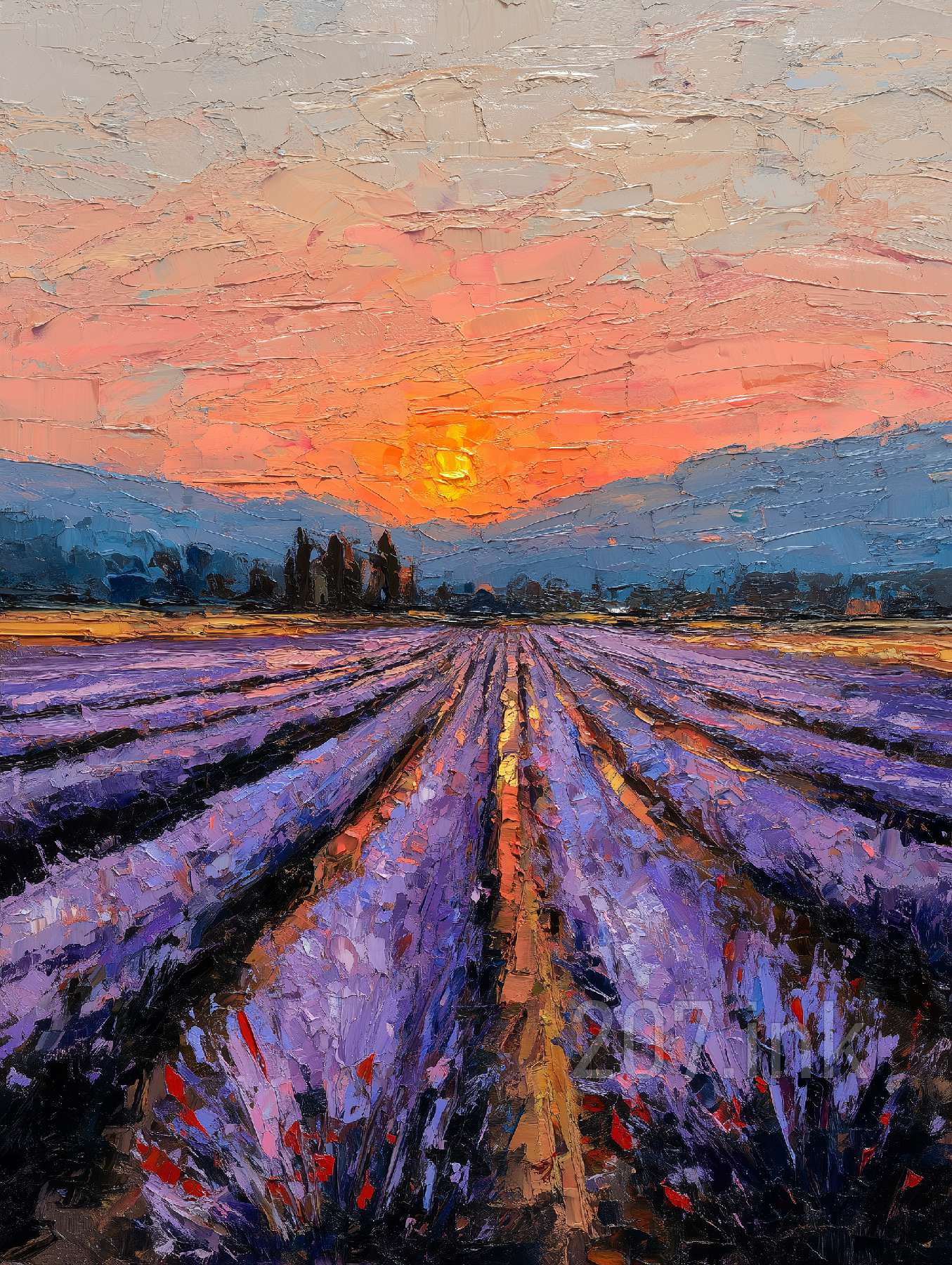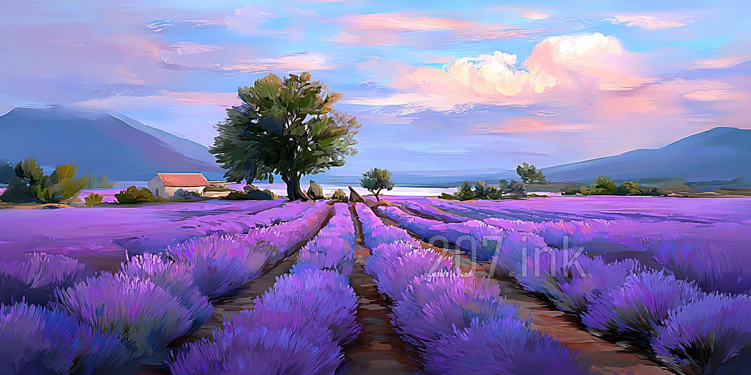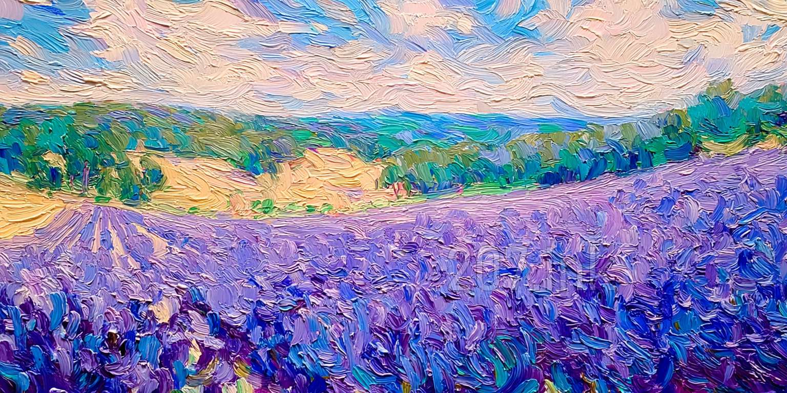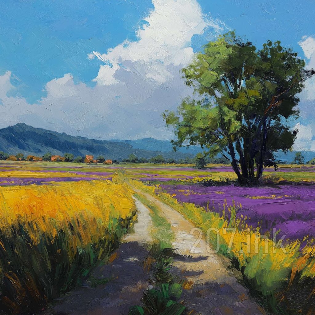 印象油画《阳光洒满的薰衣草田》