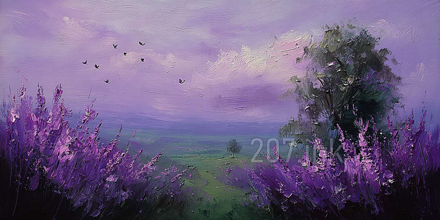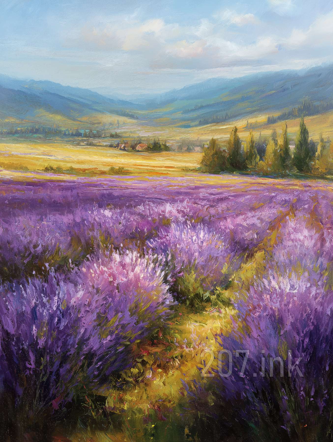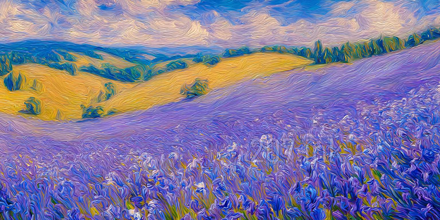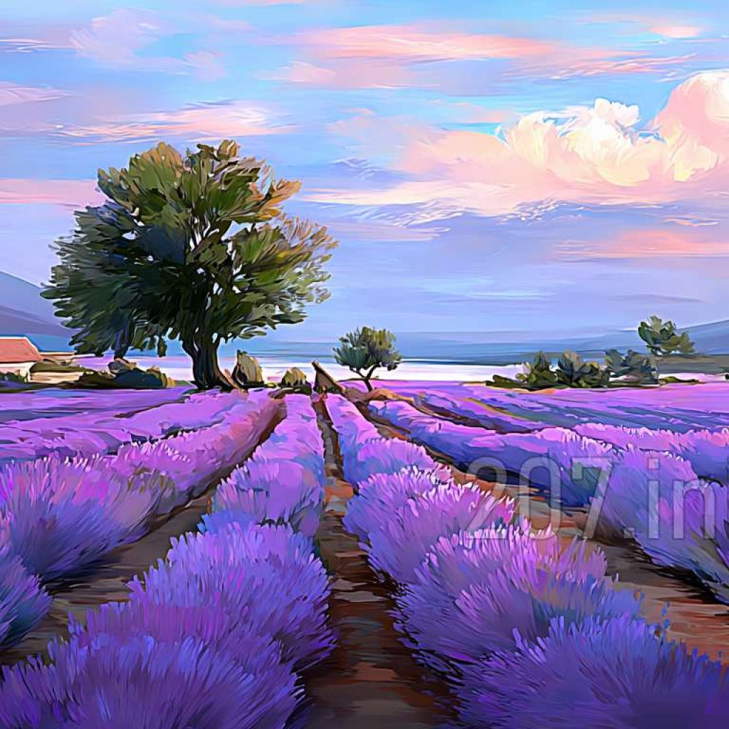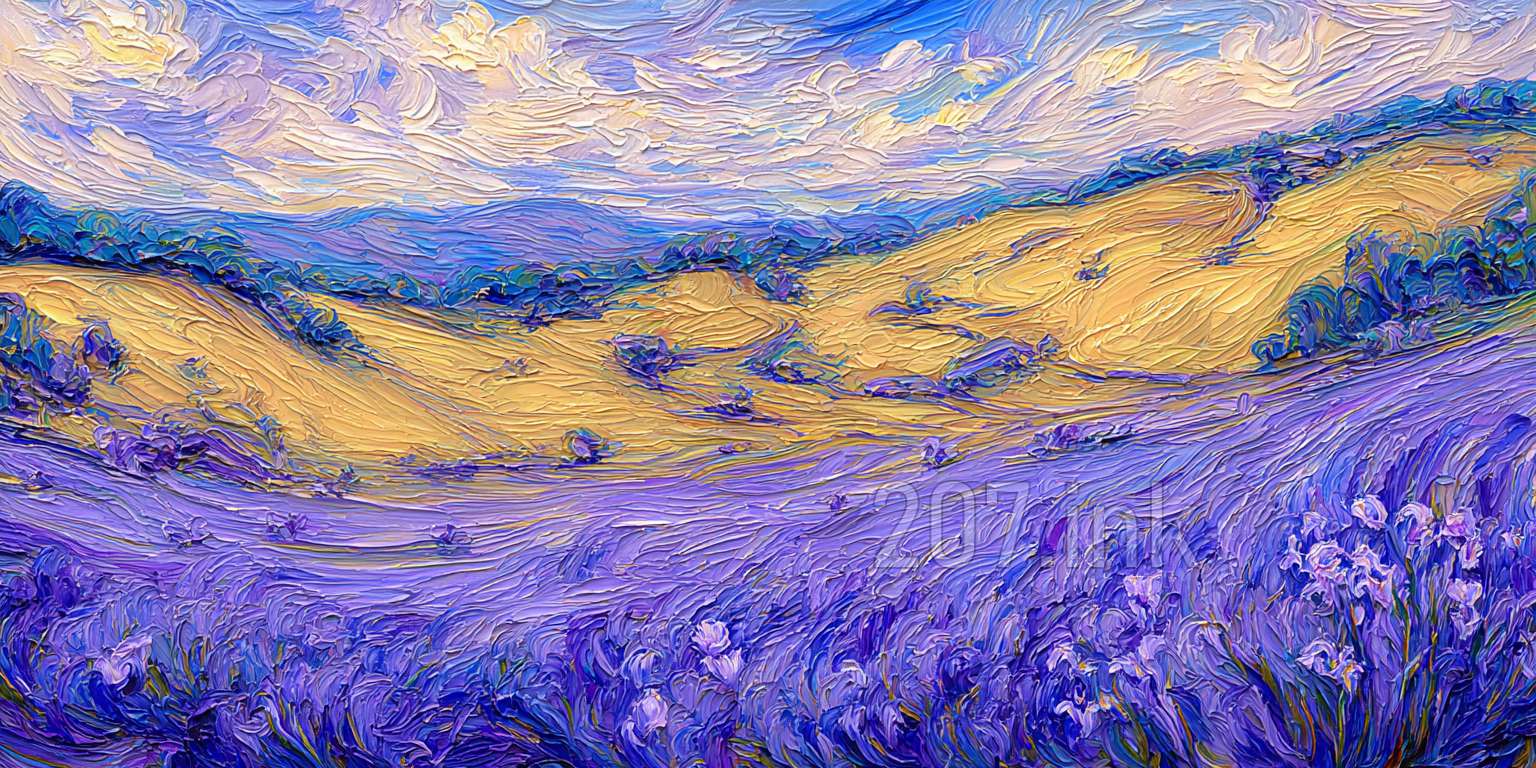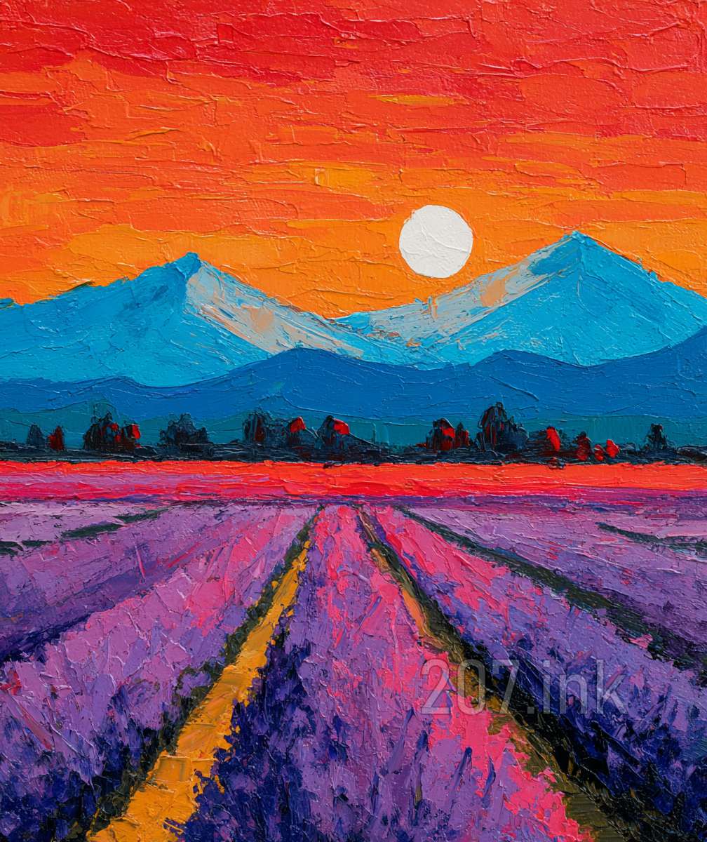 印象油画《阳光洒满的薰衣草田》