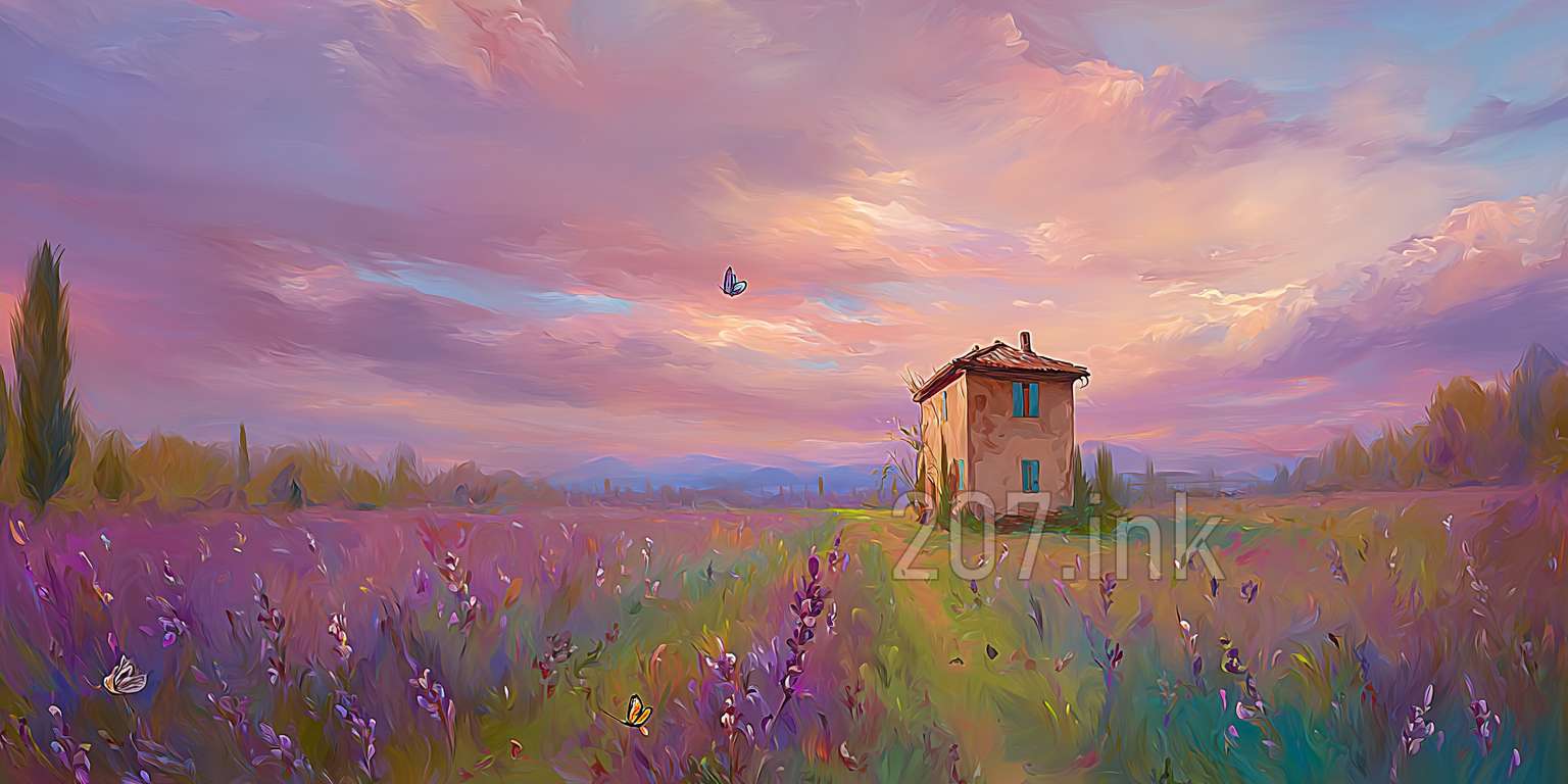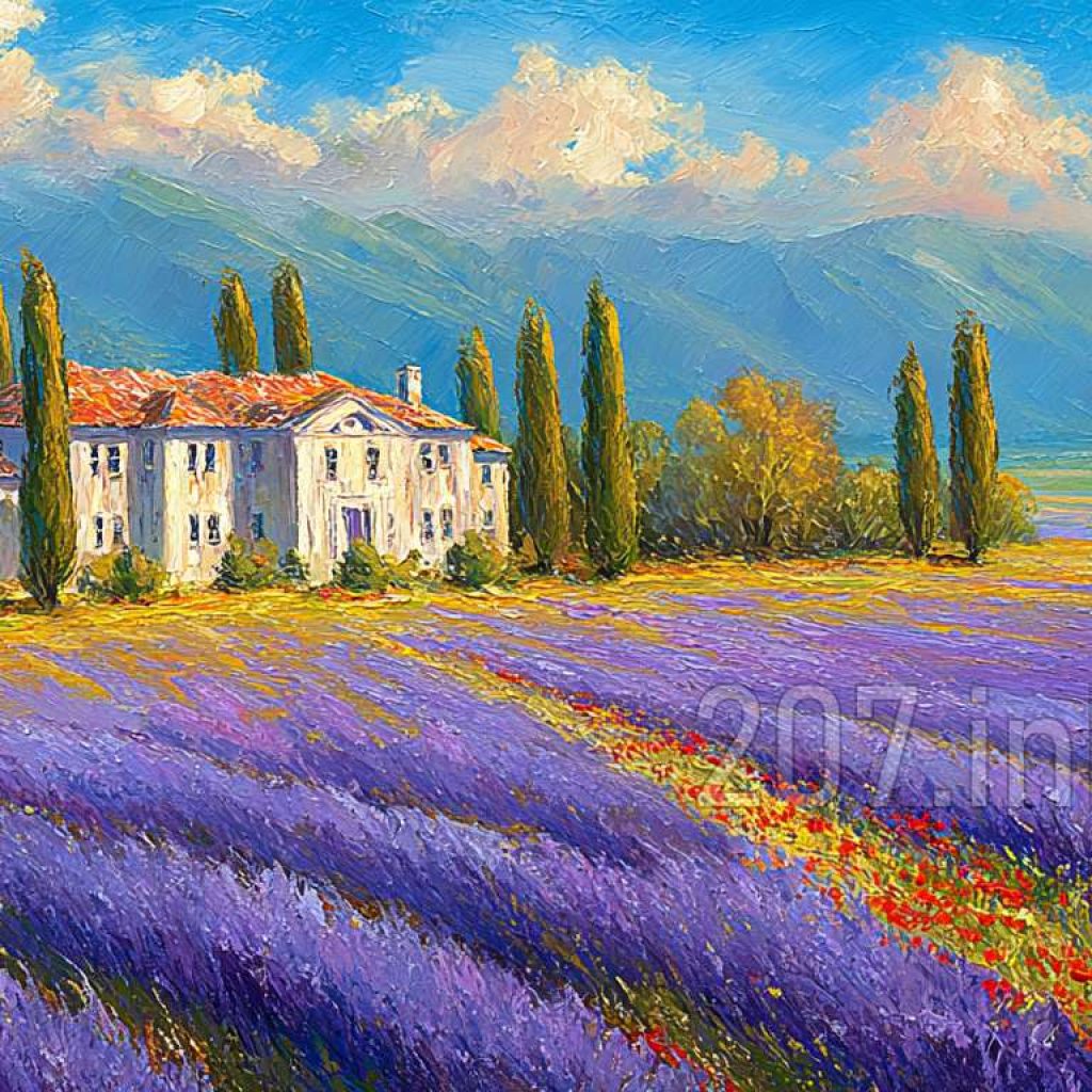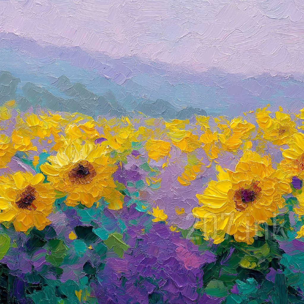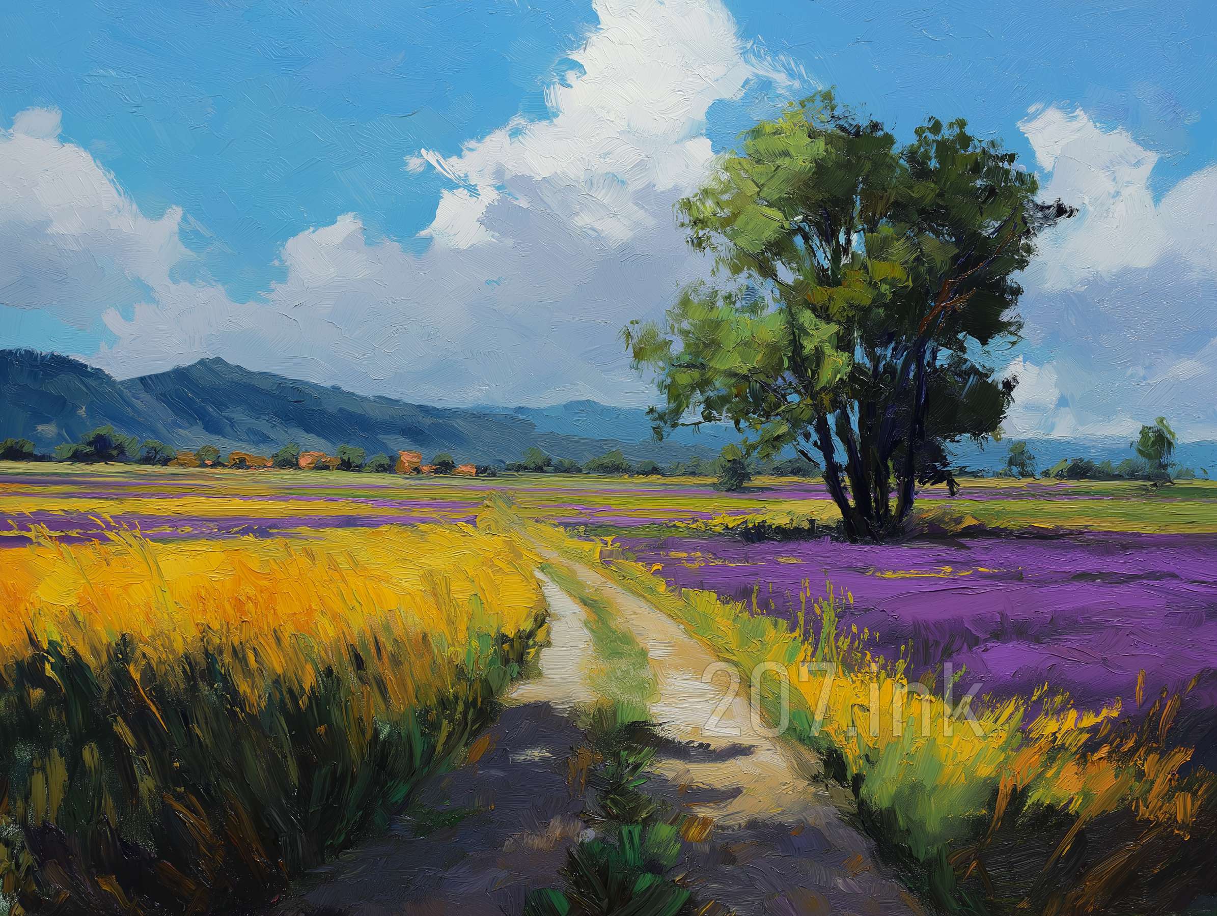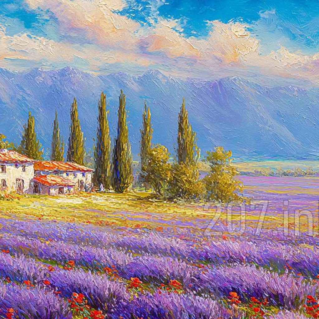 印象油画《阳光洒满的薰衣草田》