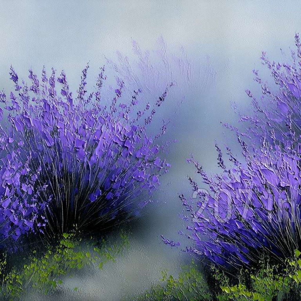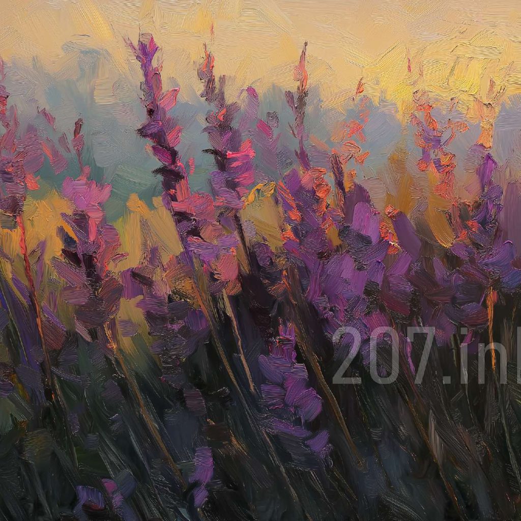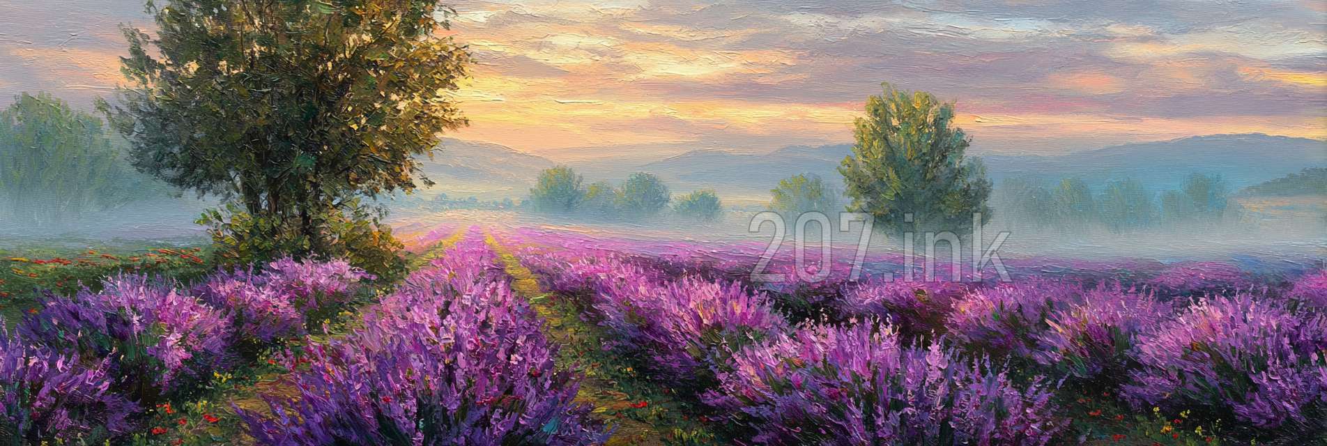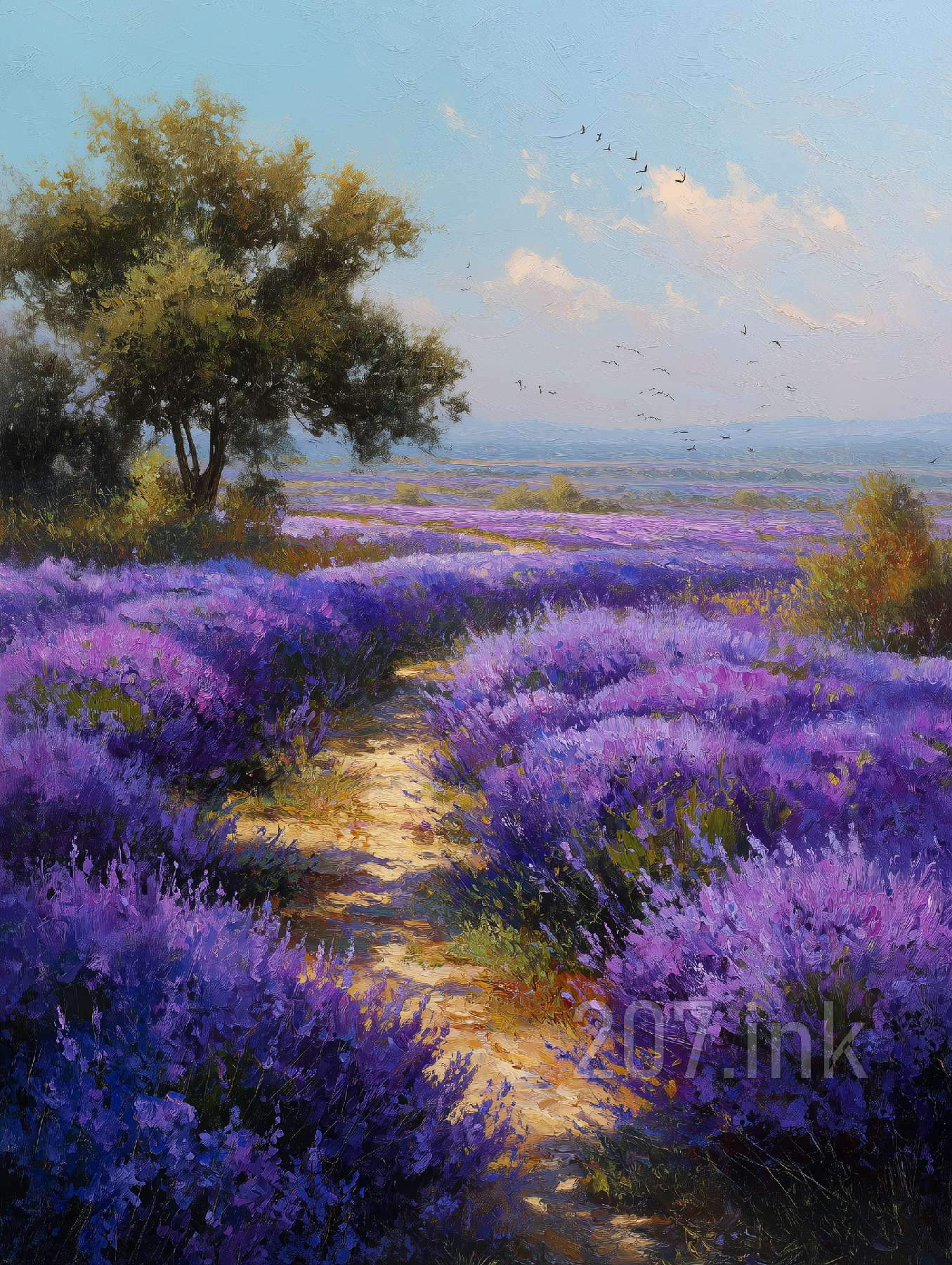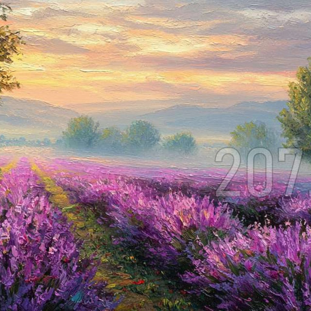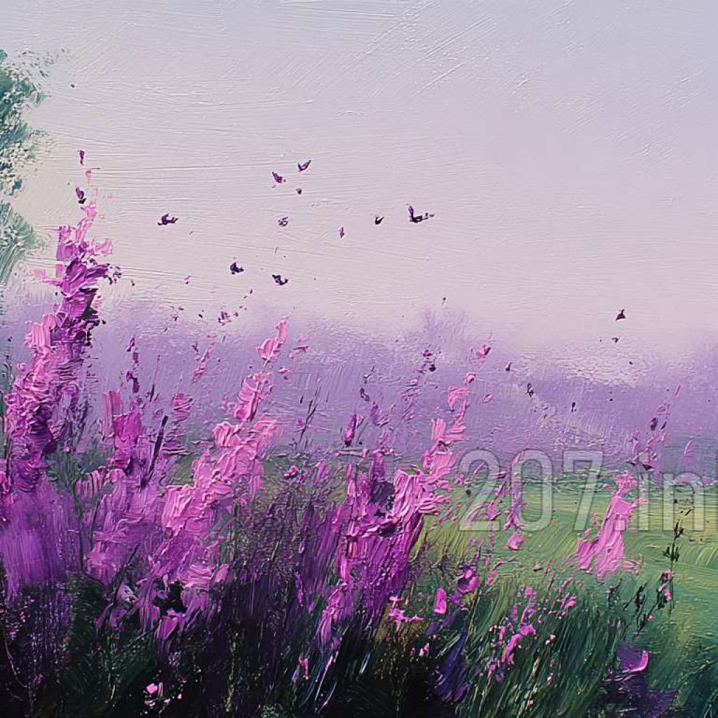印象油画《阳光洒满的薰衣草田》