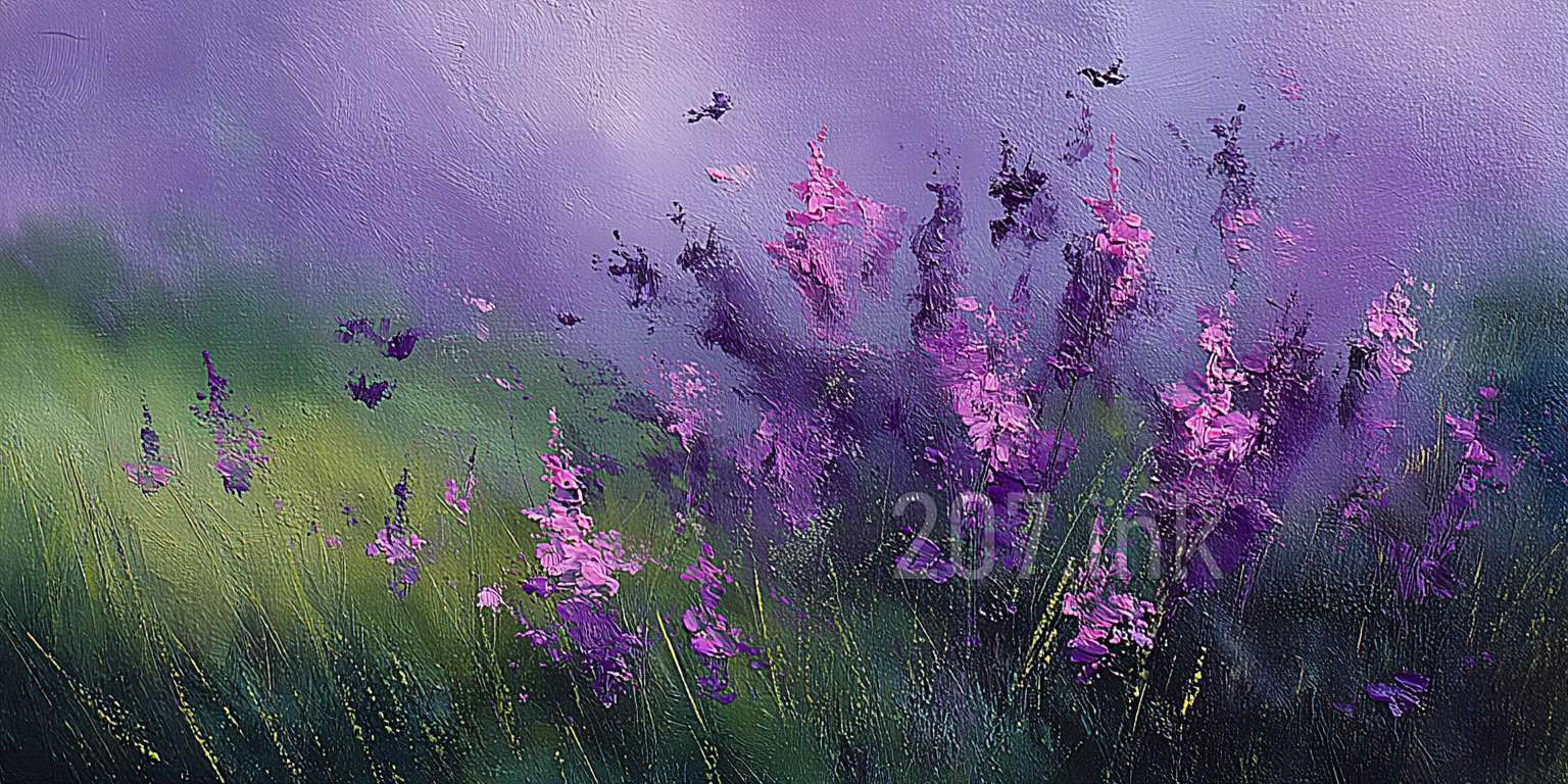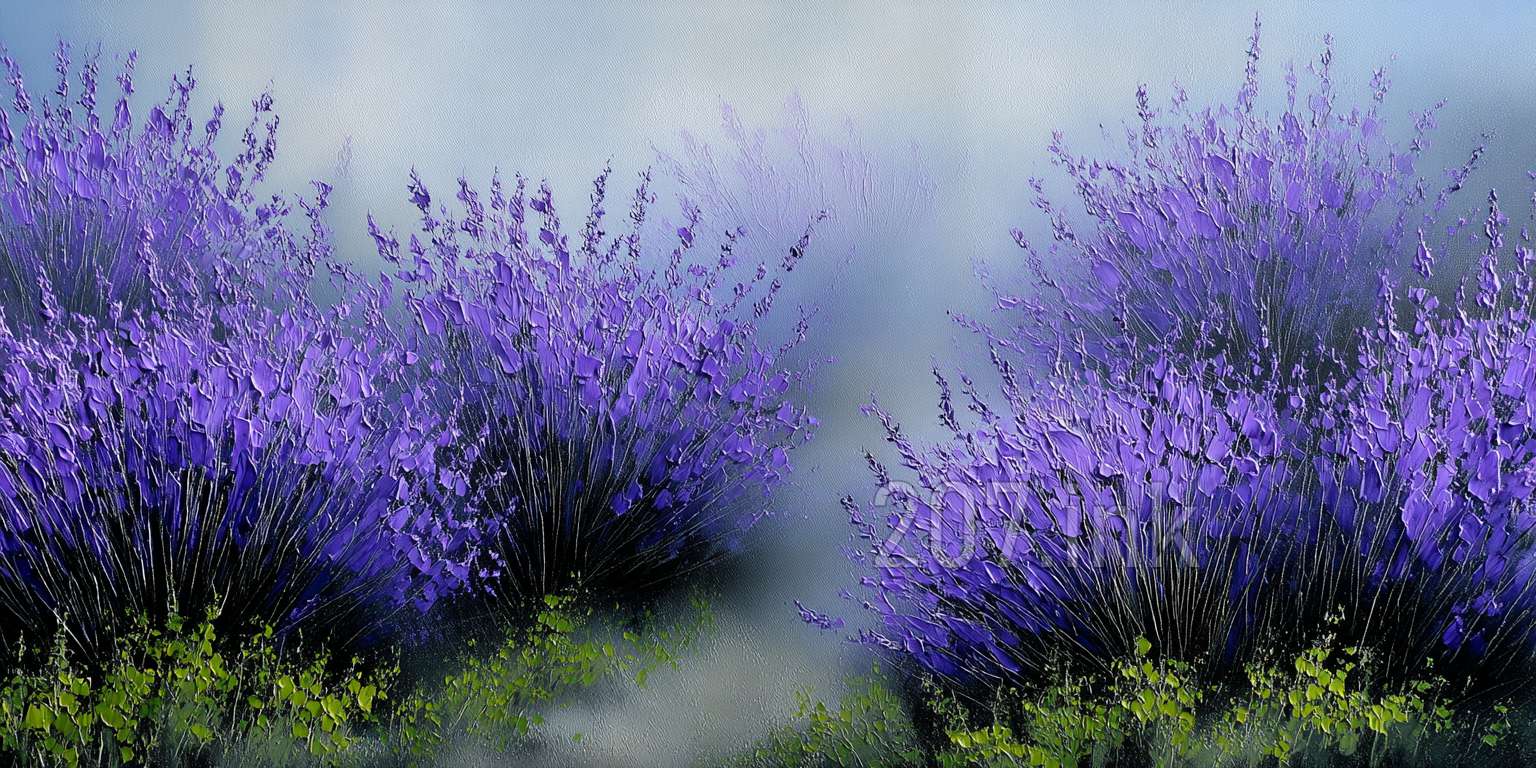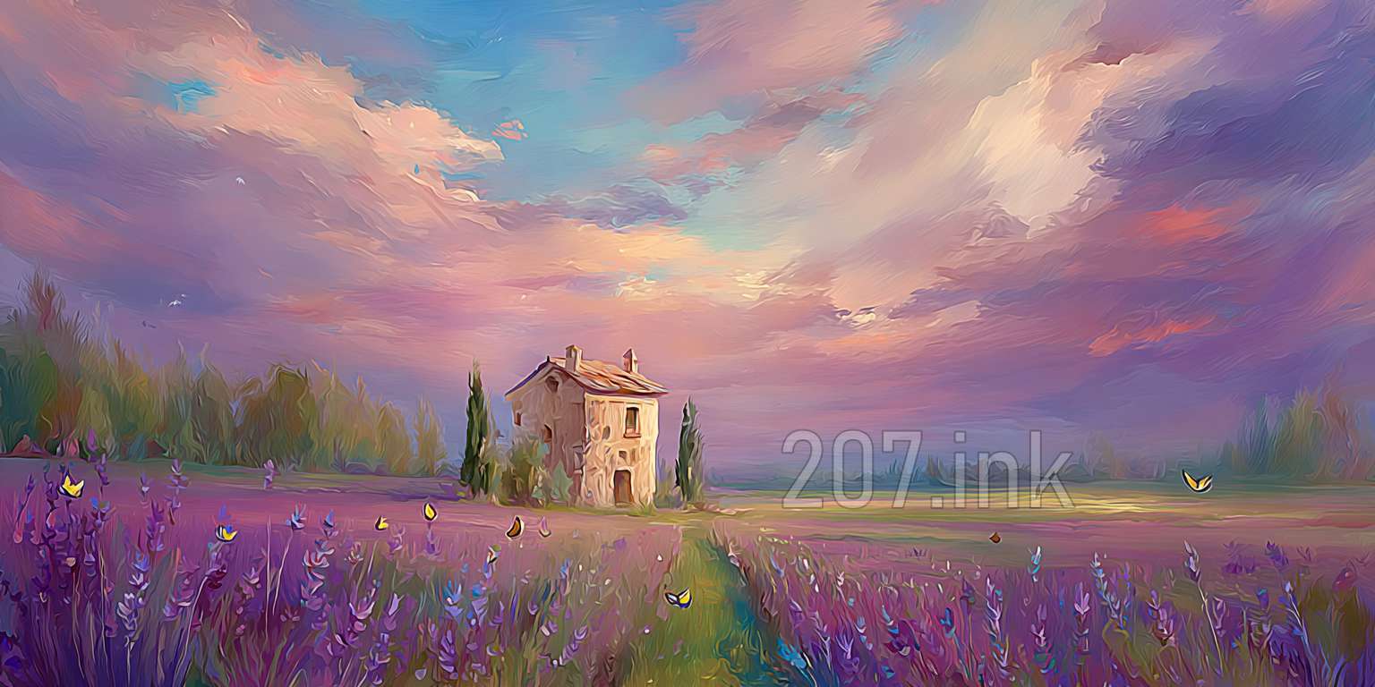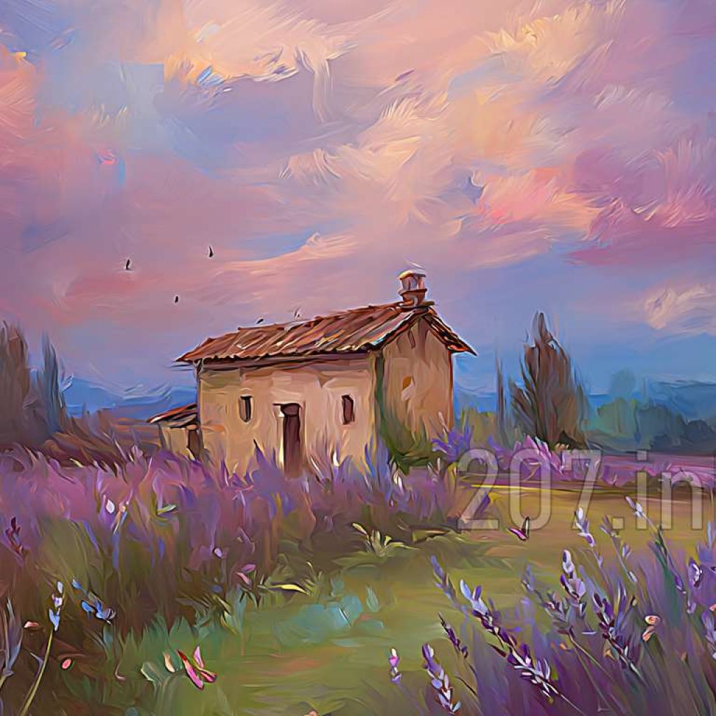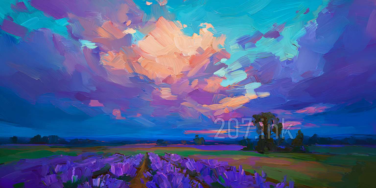 印象油画《阳光洒满的薰衣草田》