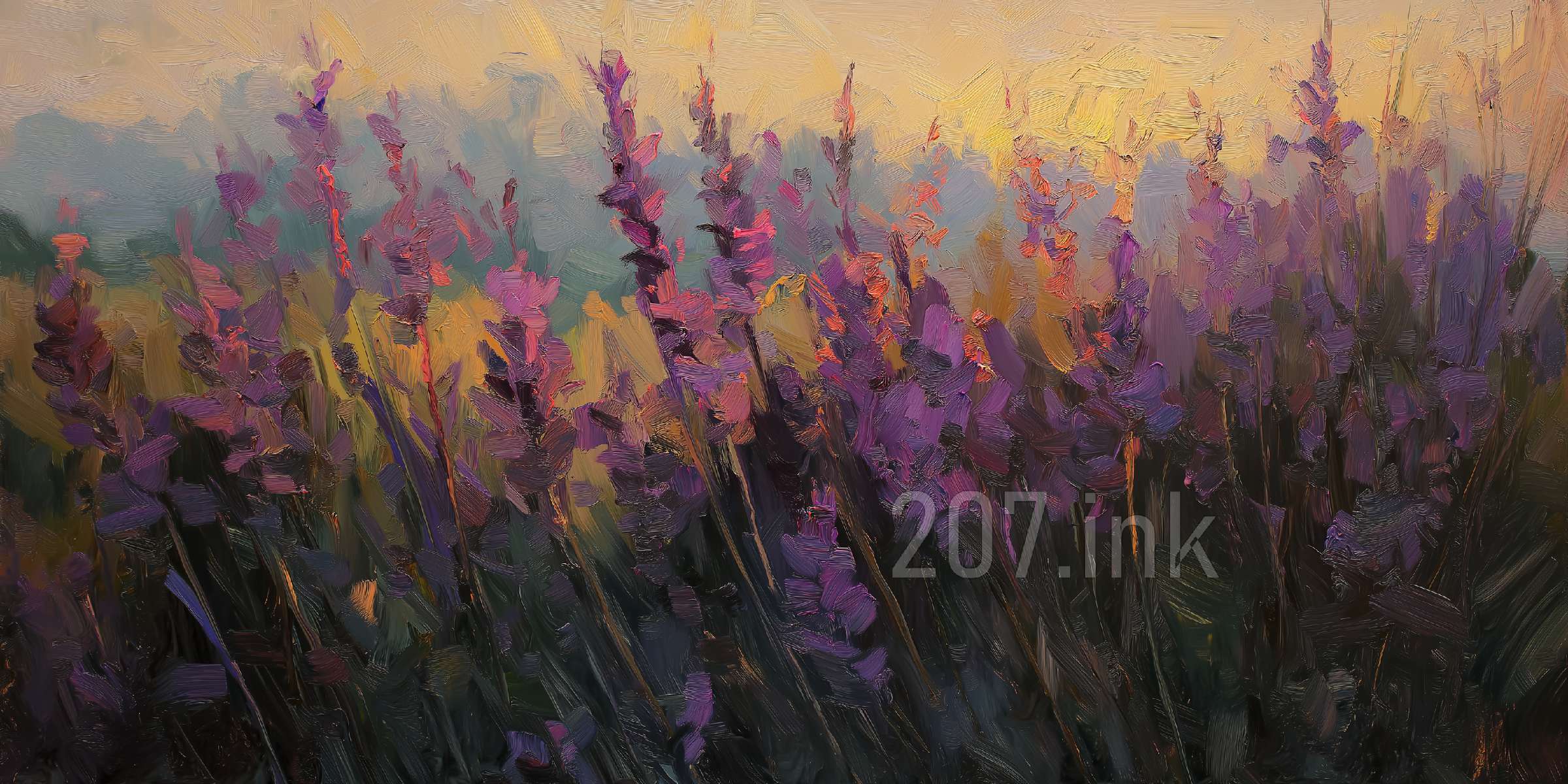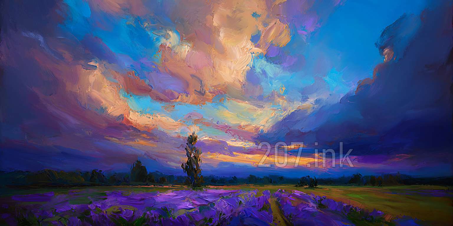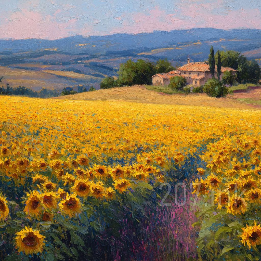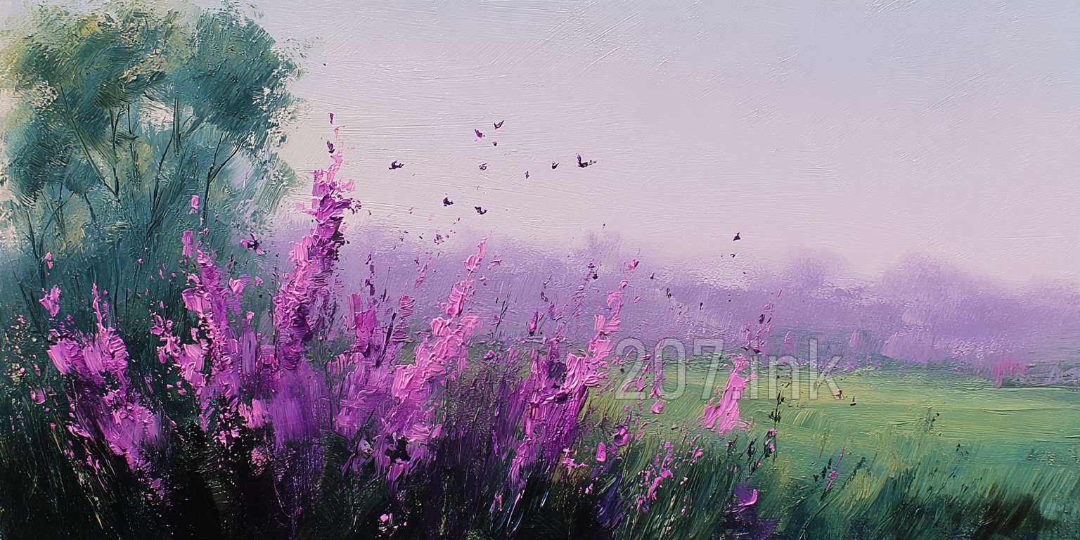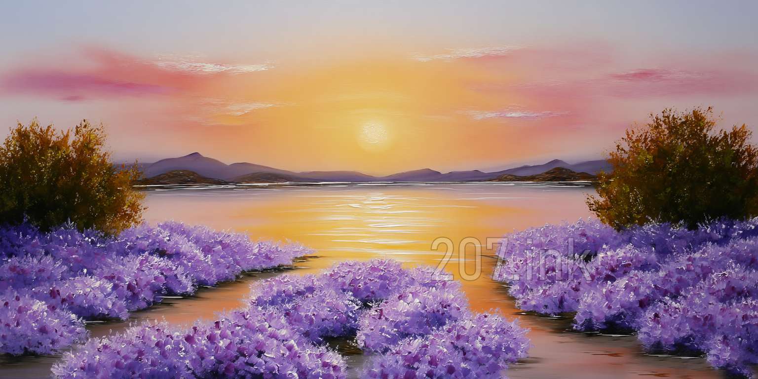 印象油画《阳光洒满的薰衣草田》
