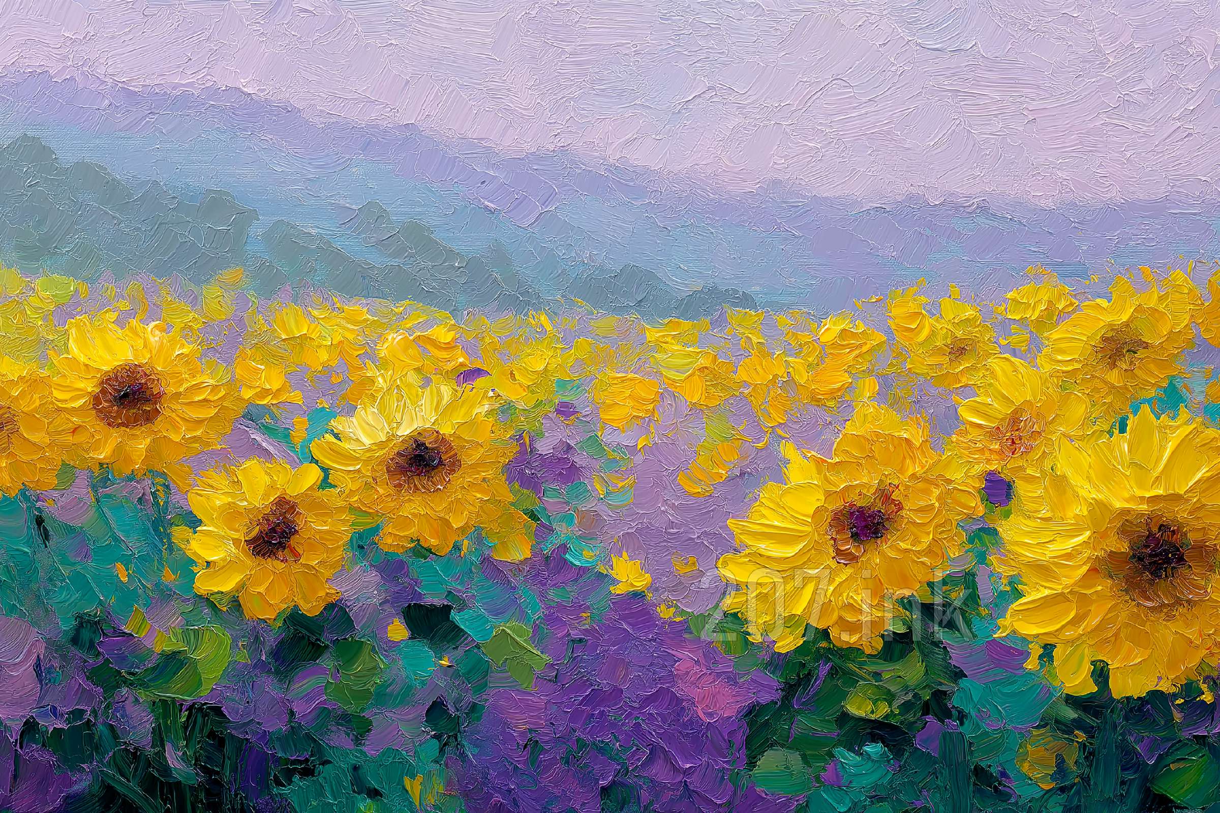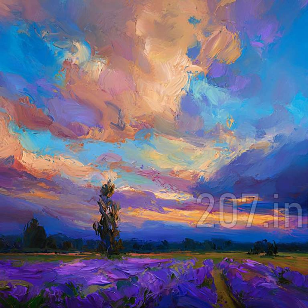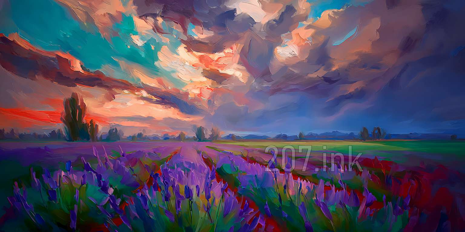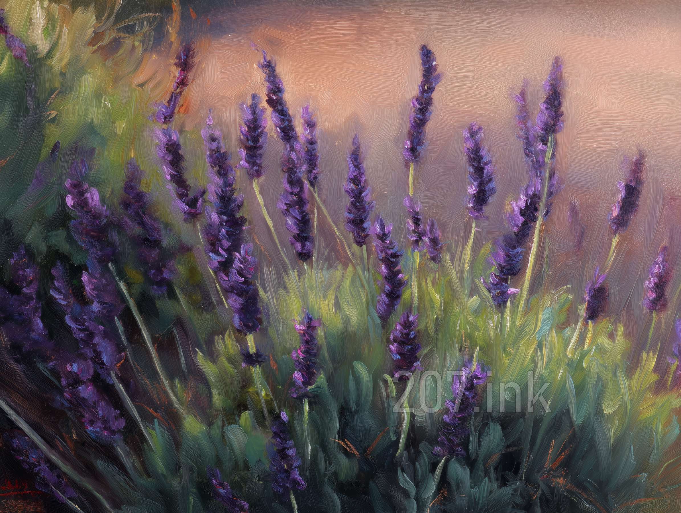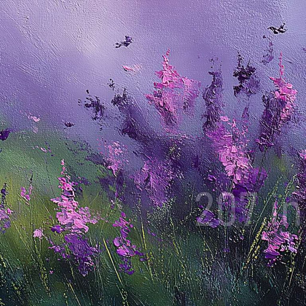 印象油画《阳光洒满的薰衣草田》