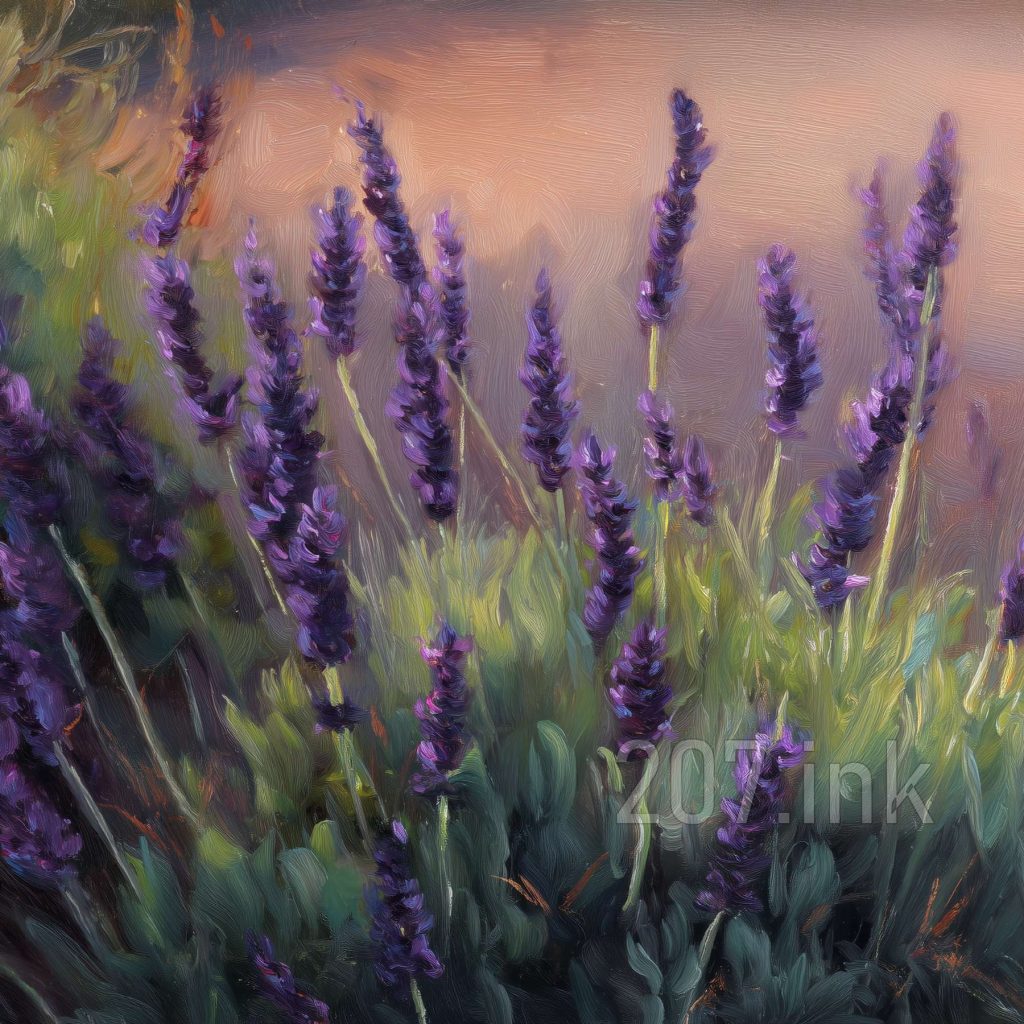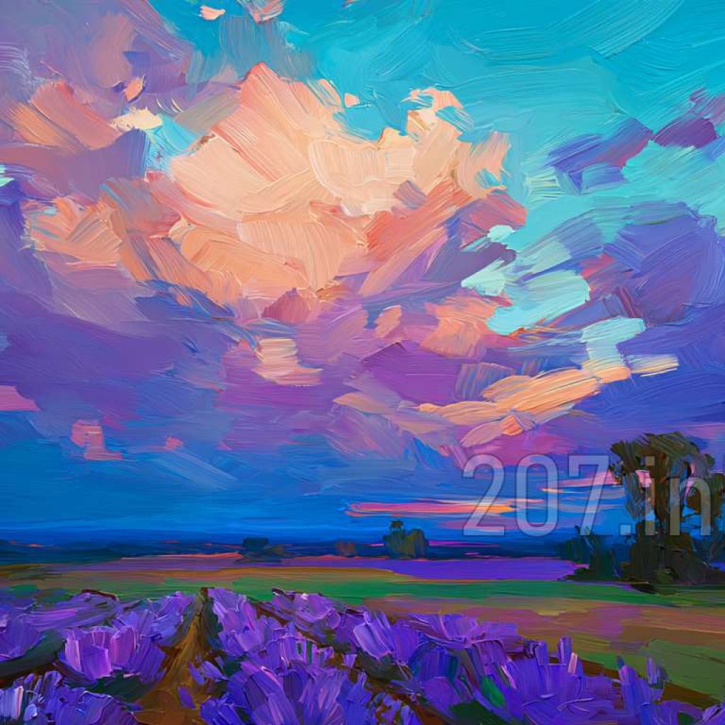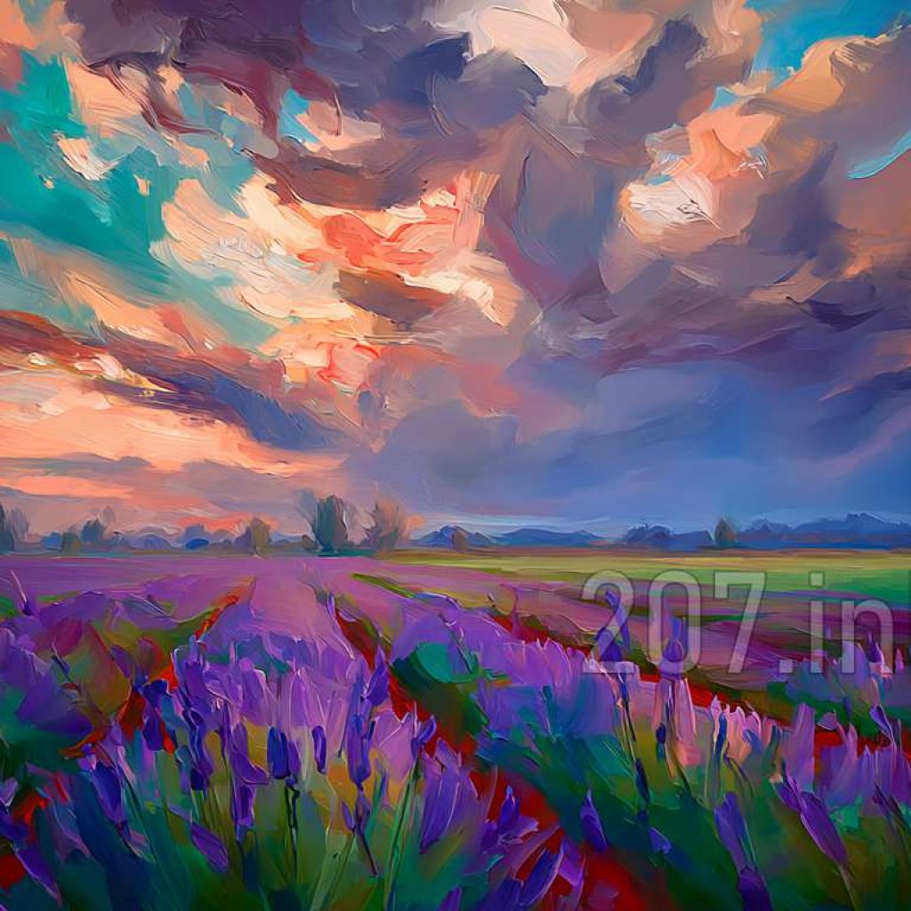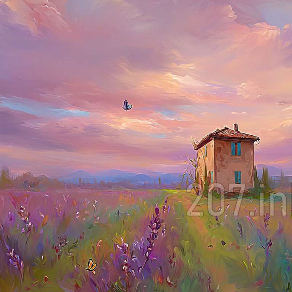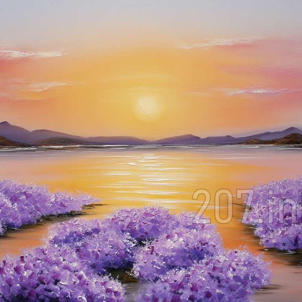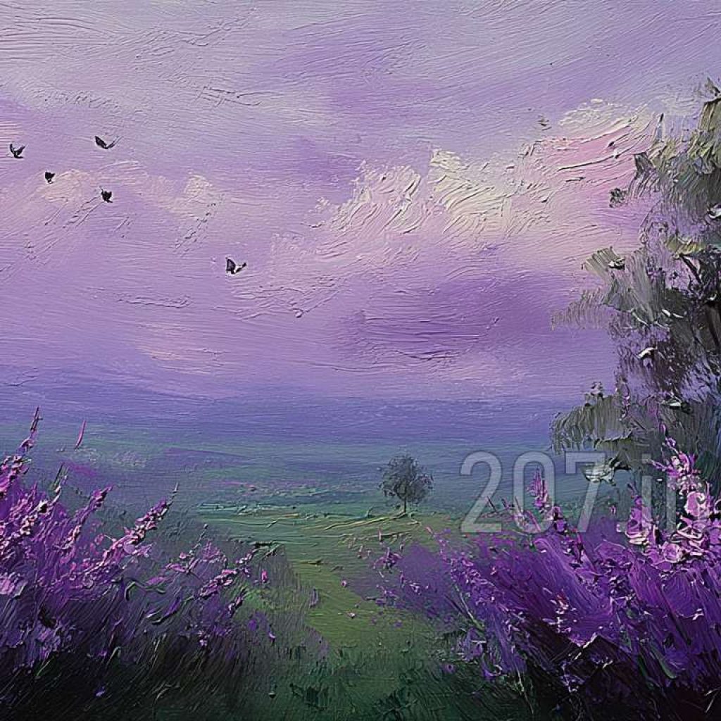 印象油画《阳光洒满的薰衣草田》