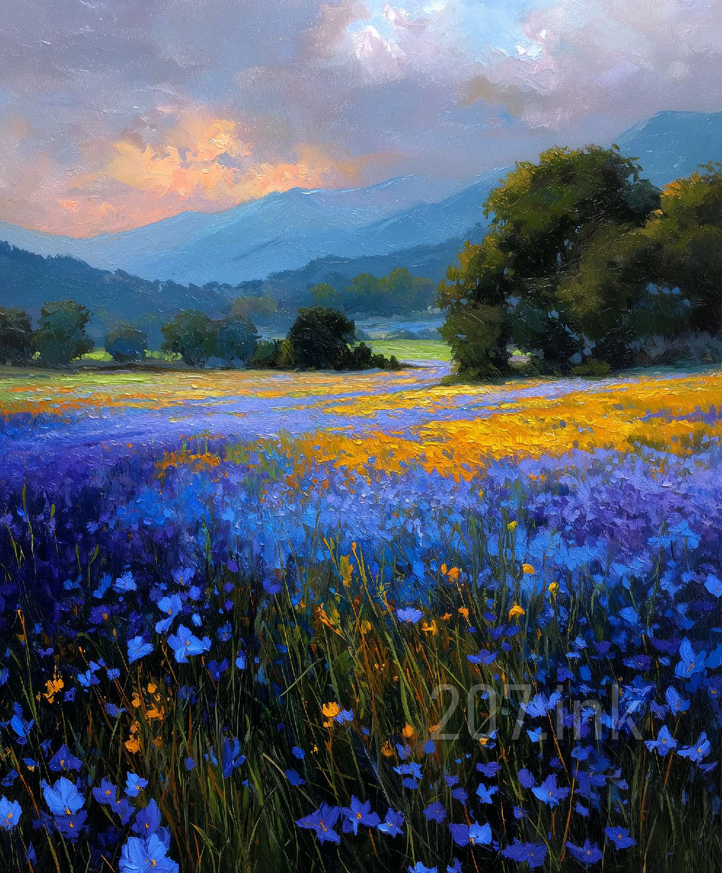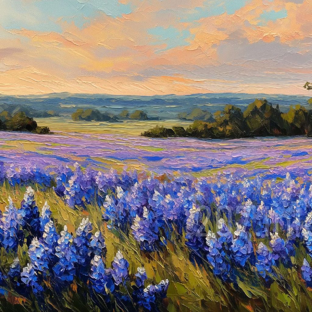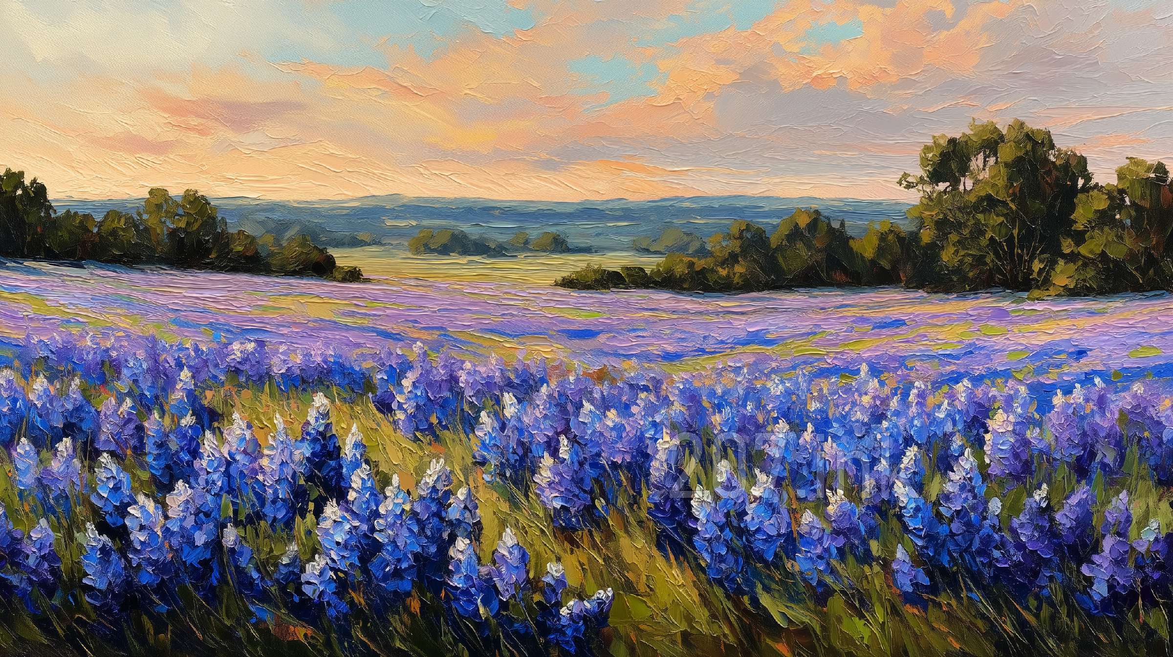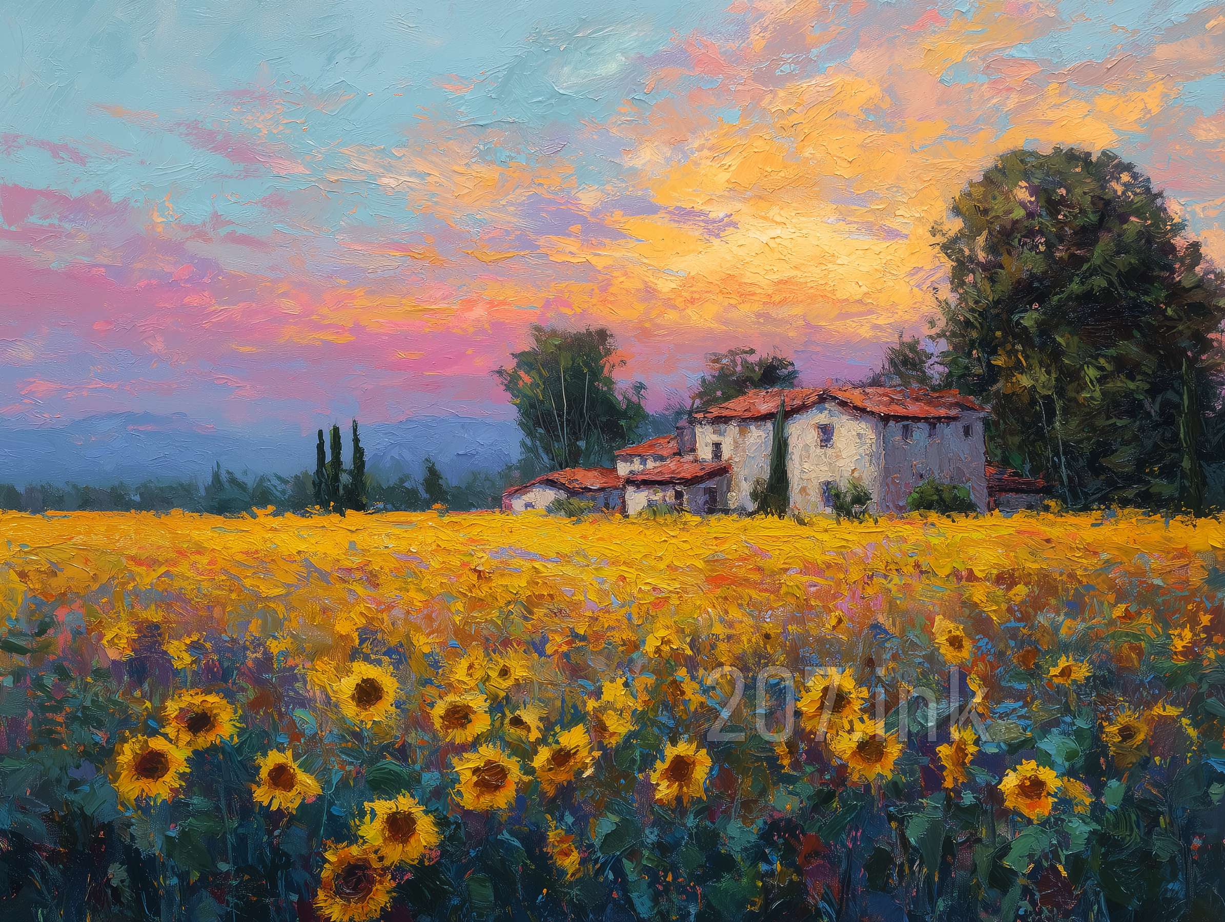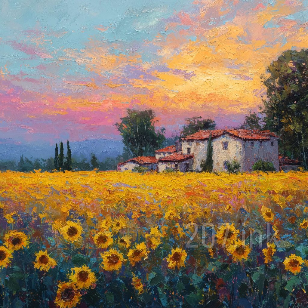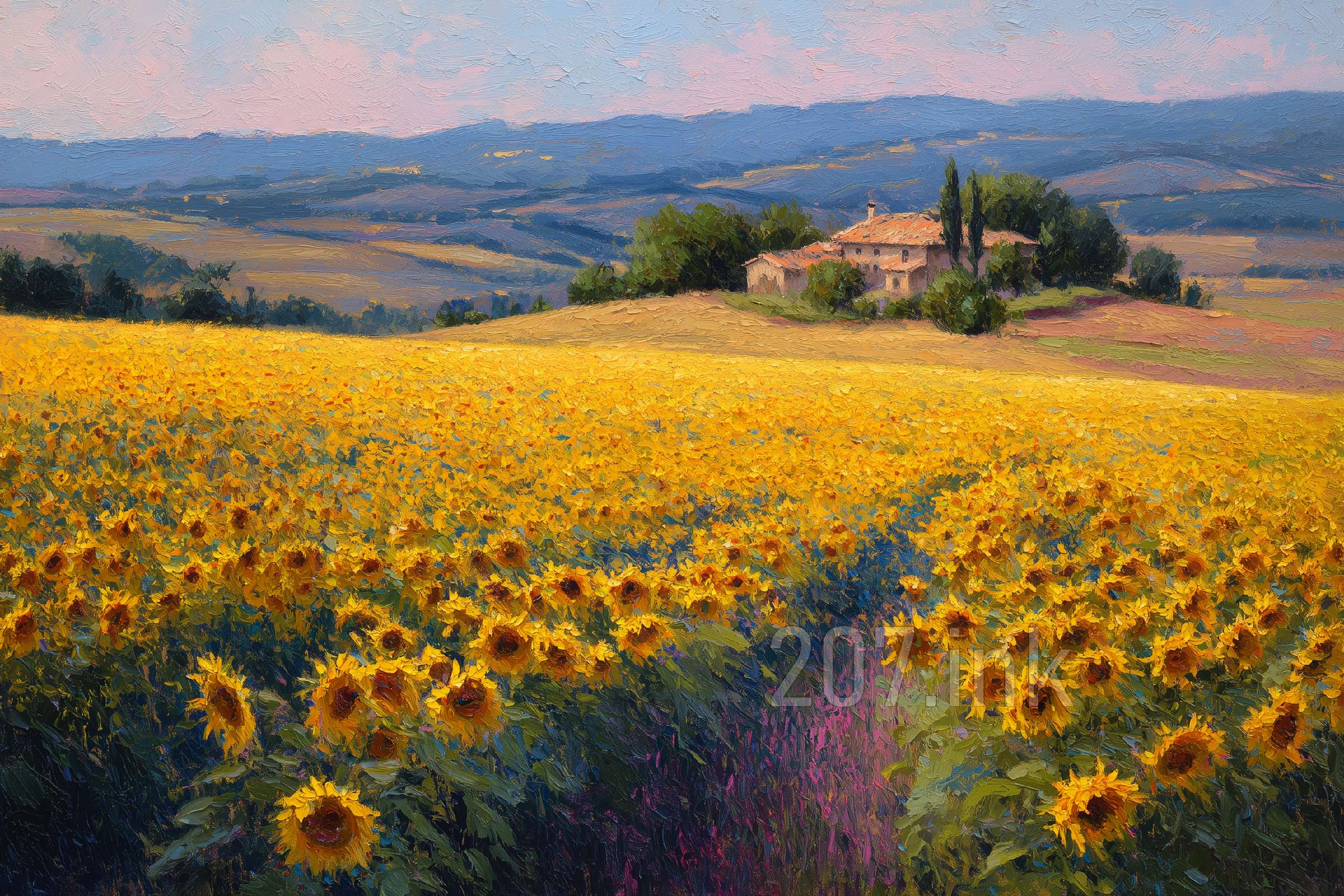 印象油画《阳光洒满的薰衣草田》